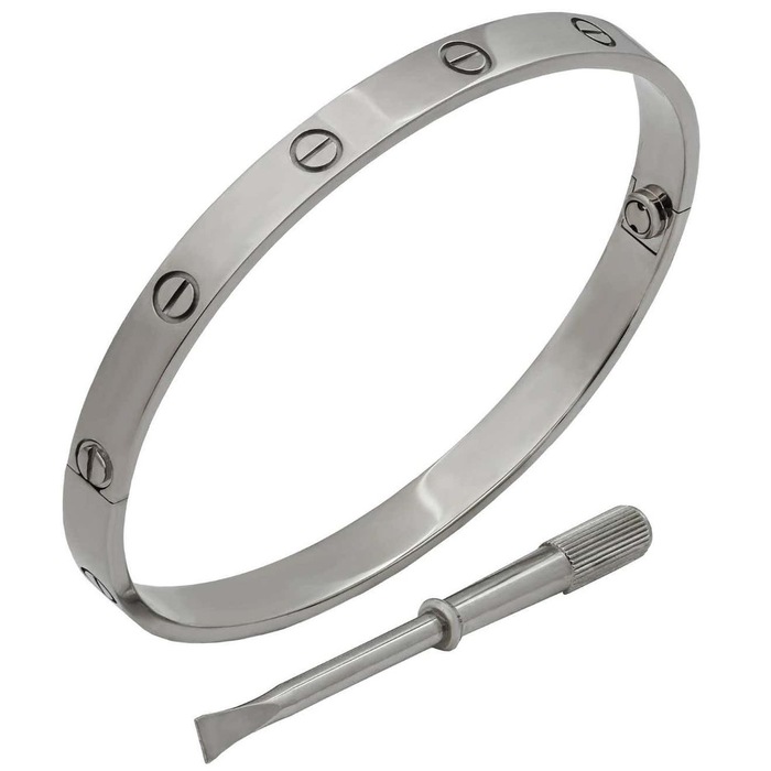 Браслеты Cartier Love выпускаются исключительно из платины и желтого, белого или розового золота 750 пробы. На внутренней стороне браслета из золота будет выгравировано число 750, что означает, что сплав на 75 процентов состоит из золота. Платиновые браслеты будут отмечены цифрой 950, что означает, что браслет на 95 процентов состоит из платины.