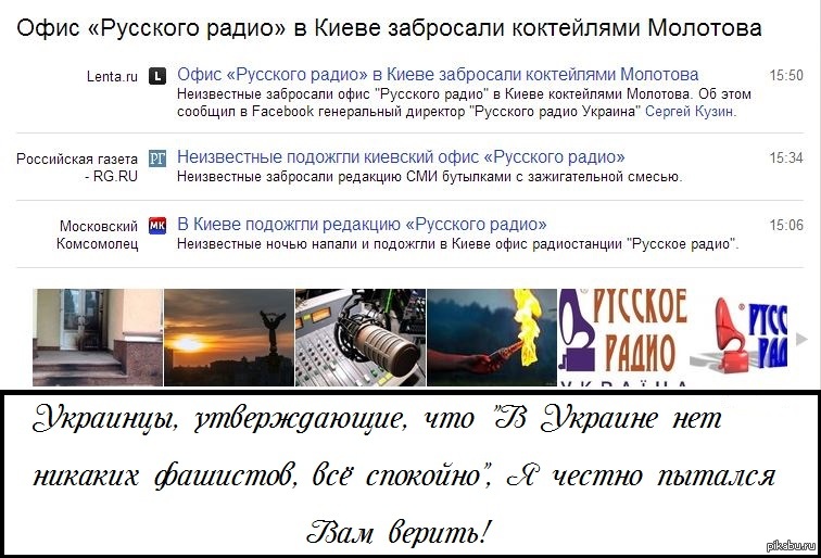 171 GordeyD 11 лет назад Братья-украинцы, Я Вам стараюсь верить, но... Киевский офис «Русского радио» забросали ночью «коктейлями Молотова» [моё] Украина Киев Фашисты