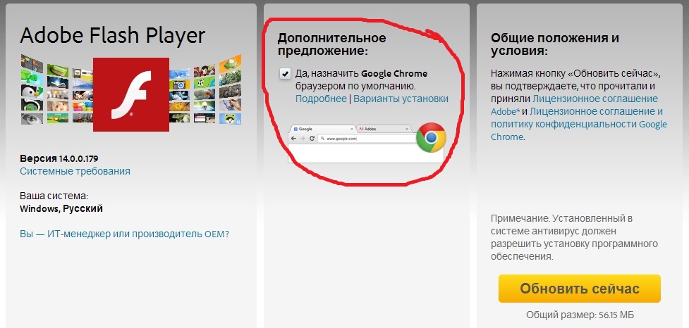 Адобфлешплеер Хром устанавливает, если забудешь галочку убрать.
