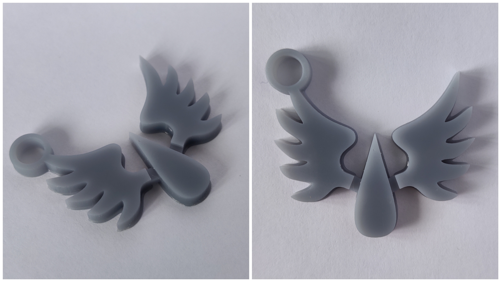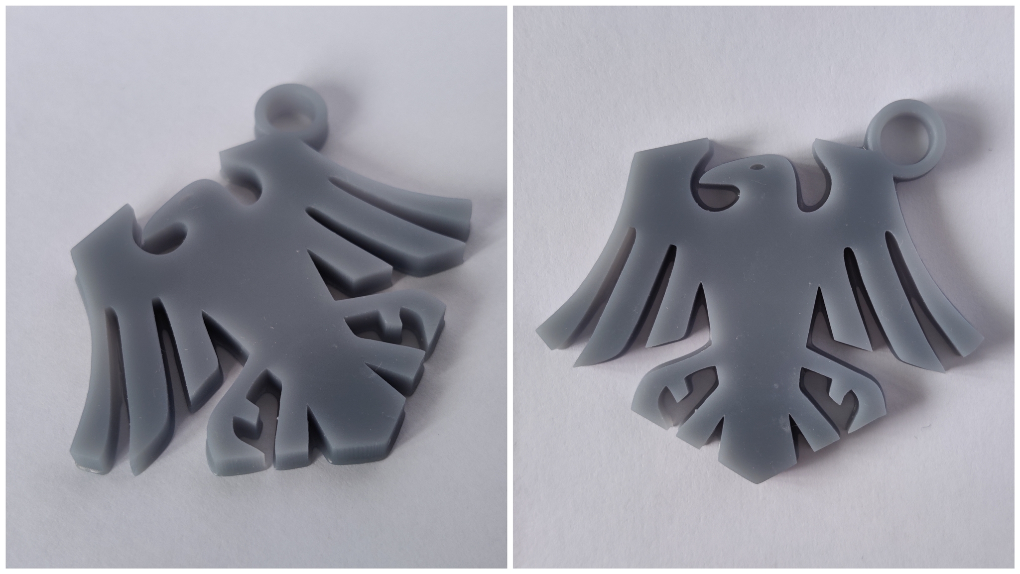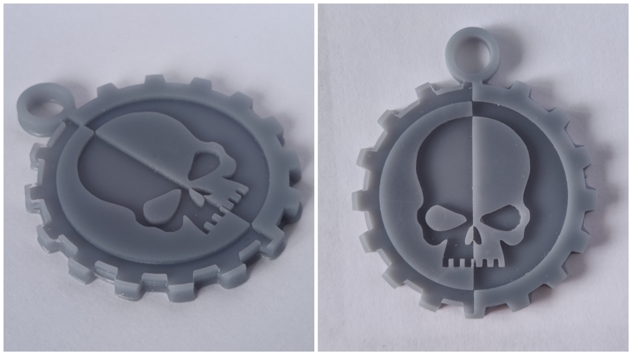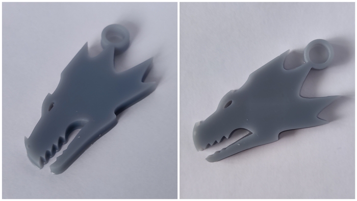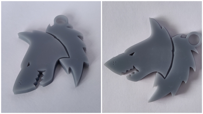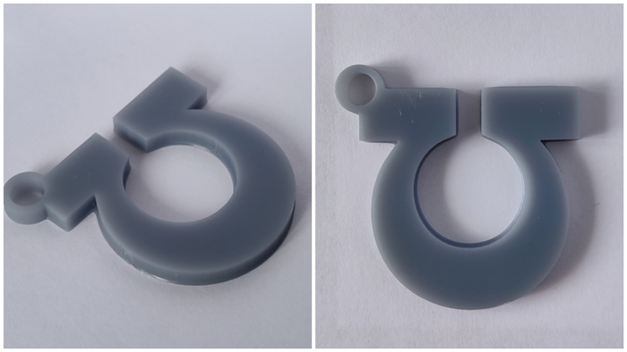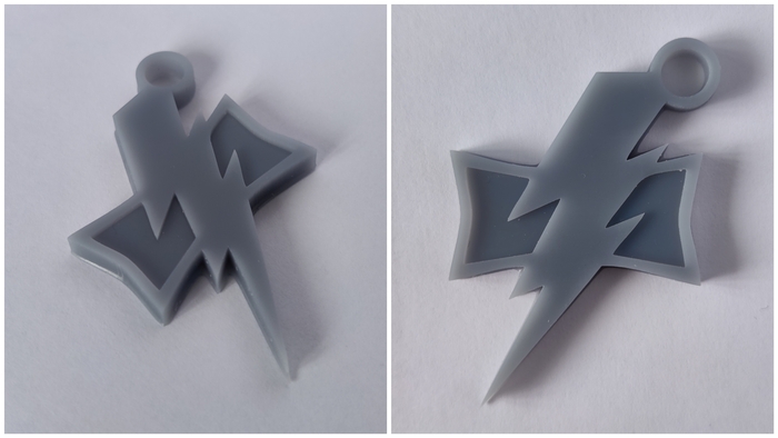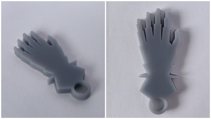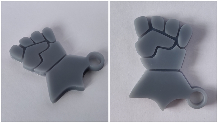 Материал брелков - серая ABS-Like смола. Размером 40мм по большей стороне. Толщина в этот раз 4мм вместо 3мм. Это неплохо добавило жёсткости и ощущается в руках гораздо солиднее.