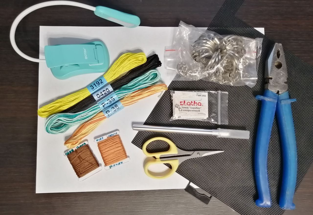 Материалы: пластиковая чёрная канва, нитки Gamma (0420, 0809, 0108, 3192, Р-35 и Р-38), замок декоративный "карабин" фирмы zlatka, фурнитура для брелоков, резак, ножницы, плоскогубцы, игла для вышивки №25, лампочка для более точечного света.