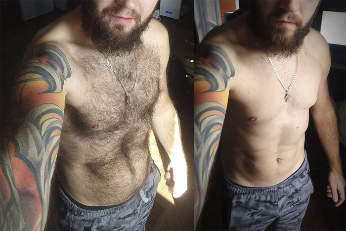 Я с 15 лет имею сильно повышенную волосатость всего меня. Я привык, но моя любознательность решила проверить, а что если. И мне нравится :) Но, вроде как и мужик должен (МУЖИК ДОЛЖЕН!) иметь волосатость. Но небольшую растительность на теле я не могу, у меня много волос или нет совсем :)