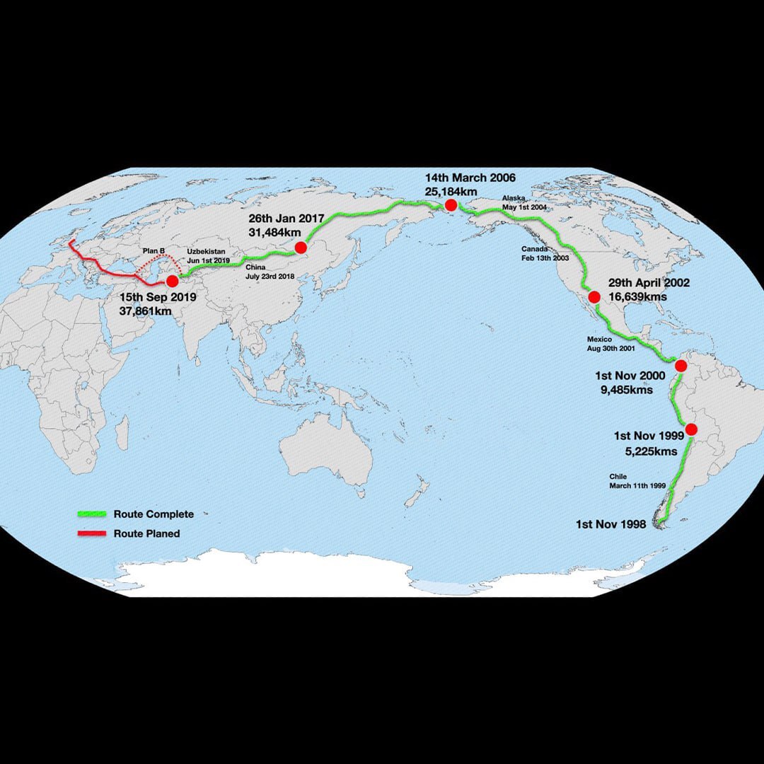 * Преодолел более 47 000 км через 25 стран, шесть пустынь, семь горных цепей;