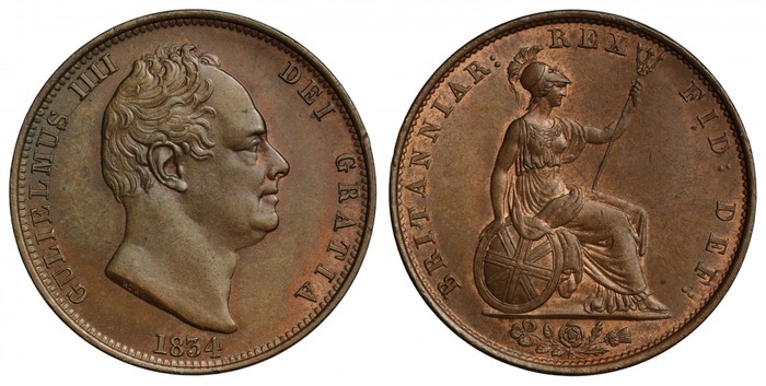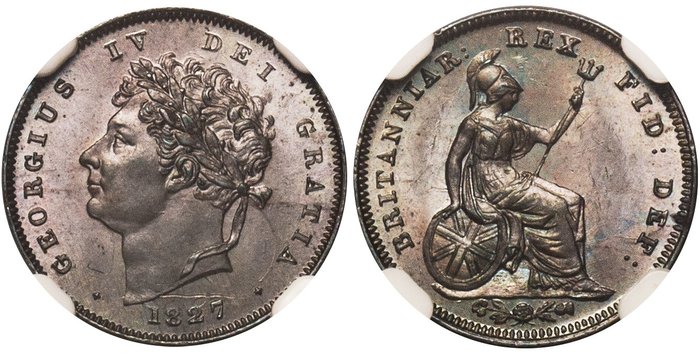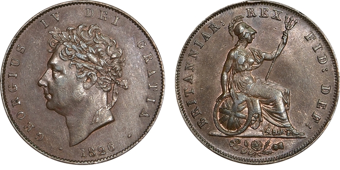 На лицевой стороне монеты 1827 года изображен портрет короля Георга IV слева, с надписью GEORGIUS IV DEI GRATIA 1827, в то время как на обратной стороне изображена сидящая Британия с щитом, обращенная вправо и держащая трезубец, с надписью BRITANNIAR REX FID DEF. Не было никаких надписей свидетельствующих о номинале монеты. Монета была изготовлена из меди и весила от 1,5 до 1,6 грамма. Имела диаметр 16 миллиметров.