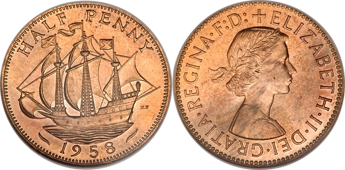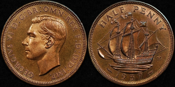 История полупенсовика , как и фартинга тянется с того же 13 столетия. Первоначально пол пенни чеканились в меди, но после 1860 года начали чеканиться в бронзе. Он перестал быть законным платежным средством в 1969 году, в преддверии перехода на десятичную систему. Пол пенни показал два разных дизайна на своем реверсе во время обращения: с Британией и с кораблем.