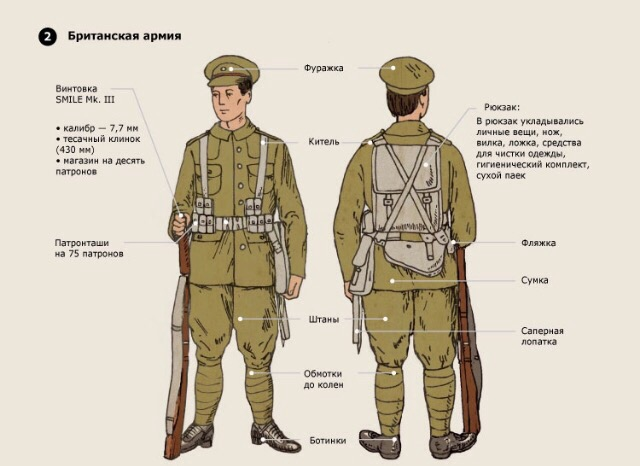 Оружие для солдат британской армии отбиралось с особой тщательностью. Была поставлена цель обеспечить солдата, насколько это было возможно в ту эпоху, большей огневой мощью. Это была винтовка «Ли-Энфилд III» (Lee-Enfield III), которая, несмотря на свою незначительную длину — всего 1,13 метра, — благодаря разумному использованию нарезки ствола обеспечивала пуле (заостренной цилиндрической формы) калибра 7,7 миллиметра начальную скорость в 671 м/с.