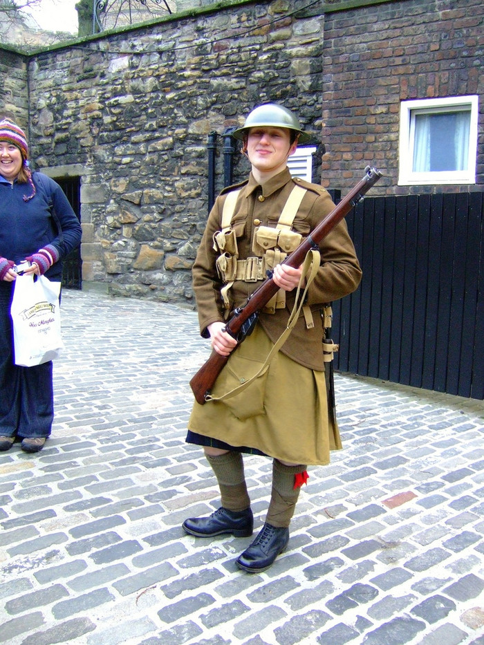 Появление на континенте первых шотландских полков вызвало неуместный энтузиазм, смешанный с удивлением. Эти странные, атлетического сложения, солдаты в «юбках», чеканившие свой тяжелый и размеренный шаг по дорогам Фландрии, лучше других переносили трудности боев и отступлений первых недель войны. Такими же, как у английских солдат, у них были только амуниция и вооружение. Их головной убор был «Гленгерри», немного похожий на современную пилотку: темно-зеленый без повязки у хайлендеров и камеронцев, темно-синий с повязкой в форме красных, черных и белых квадратов у лоулендеров. Кроме того, шотландцы носили круглый головной убор цвета хаки — так называемый tam-o-shanter.