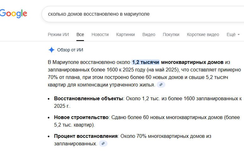 А пока британцы тявкают, порядка 1,2 тыс. многоквартирных домов восстановлено в Мариуполе с момента освобождения от украинских боевиков три года назад (данные на 20.05.2025). Об этом сегодня Донецкому агентству новостей сообщили в пресс-службе администрации города dan-news.ru.