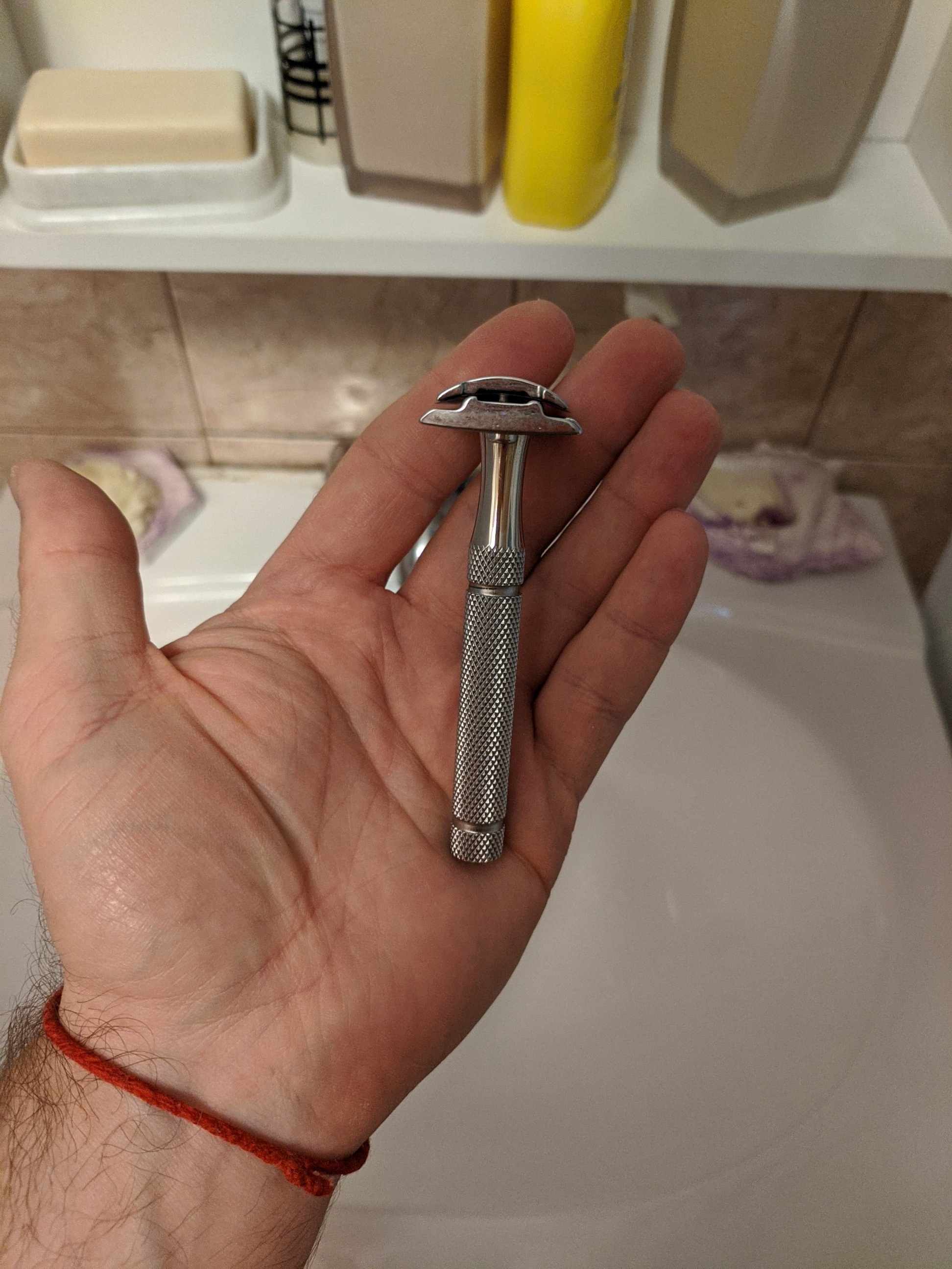 Купив к ней лезвия Спутник в ближайшем Магните я пошел бриться))) К сожалению ничего хорошего у меня не вышло. Лицо как-будто кирпичом натерли. Два дня ходил как вождь краснокожих)) Но интерес не пропал, возникли только вопросы. И вот начитавшись постов и насмотревшись видосов, не желая тратить лишних денег решил брать регулируемый станок.