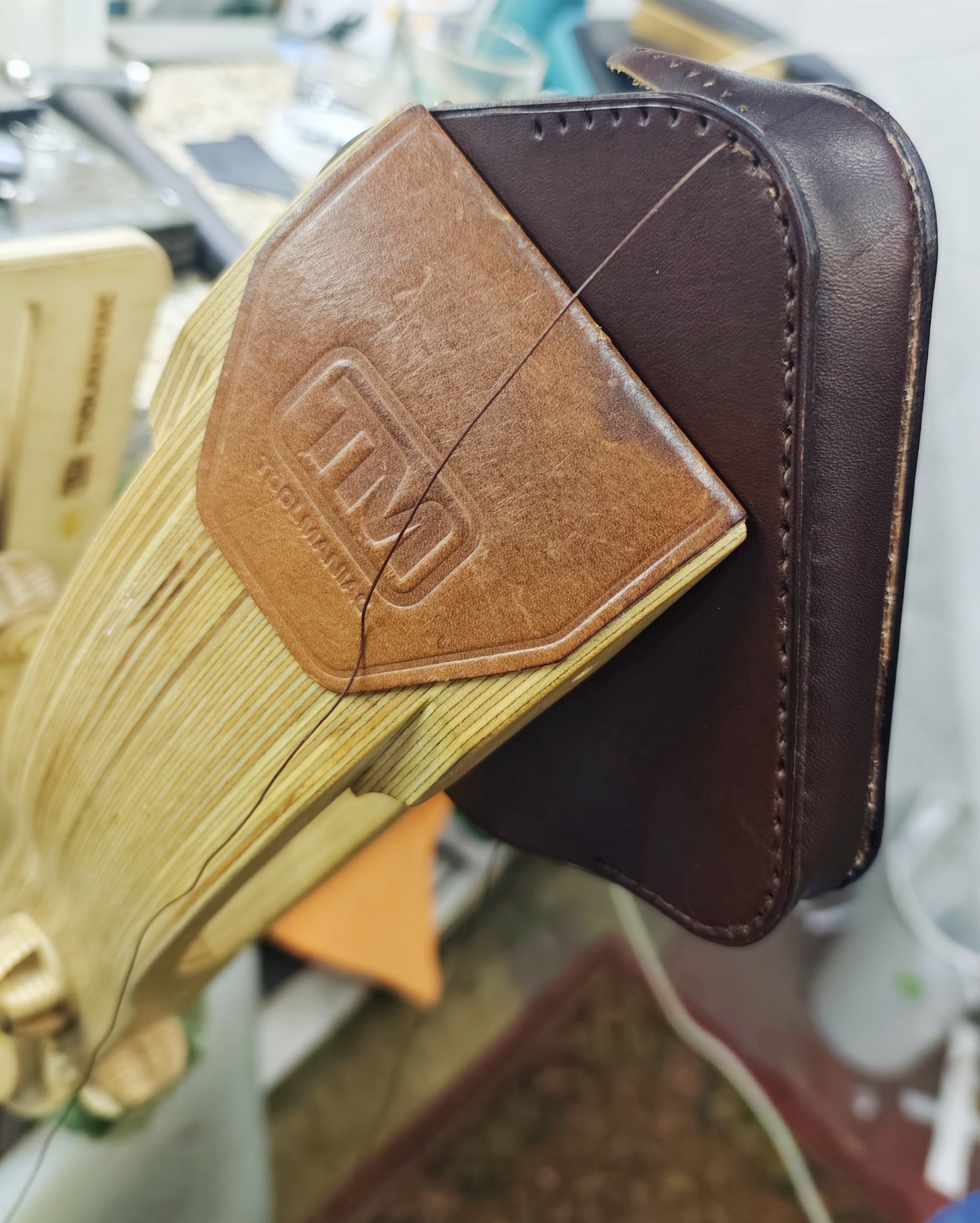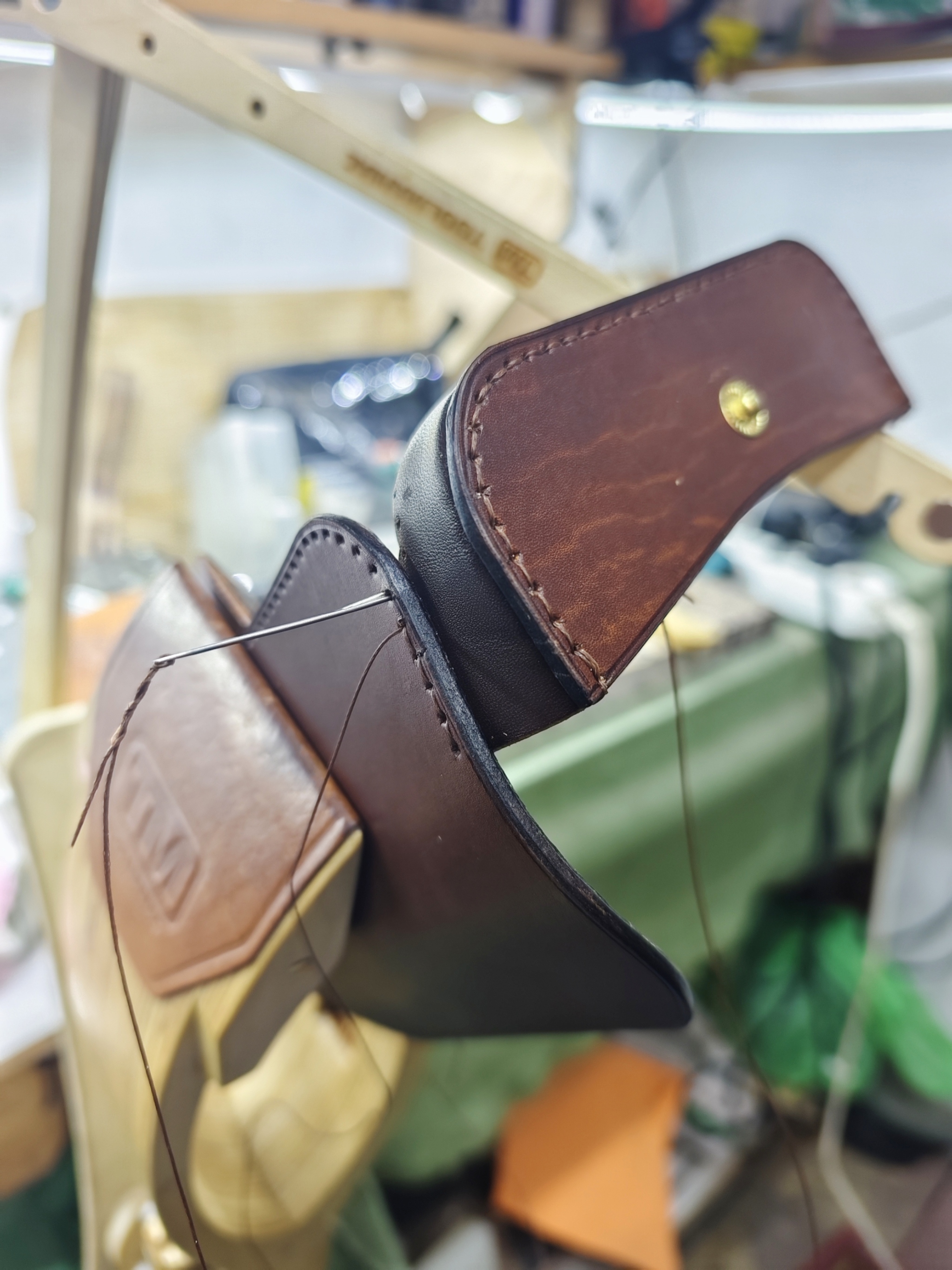 Осталось сшить детали. И это охренеть какой непростой квест. Шить изнутри такие мелкие детали само по себе непростая задача, а здесь ещё такая жёсткая кожа. Примерно вот так выглядит процесс: