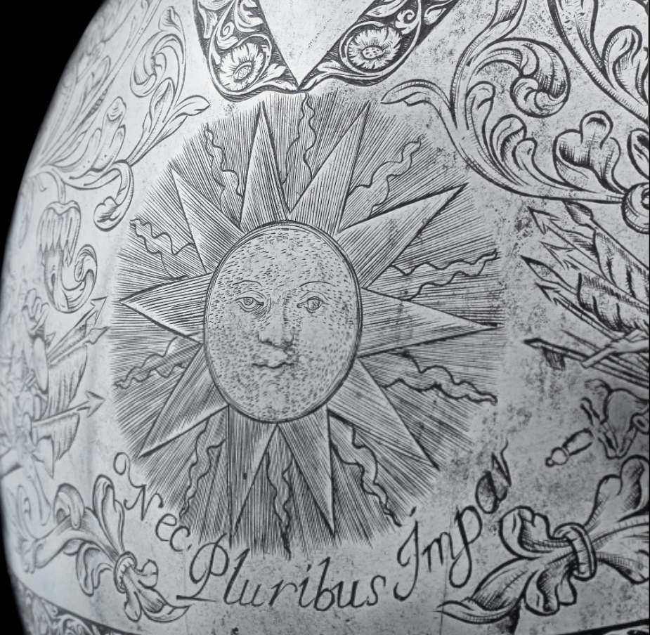 Доспех довольно архаичен для второй половины XVII века, но отличается высочайшим качеством декора. В том числе например, на шлеме изображены французские геральдические лилии (fleur-de-lis), эмблема самого Людовика XIV в виде солнца с человеческим лицом, а также девиз этого монарха - Nec pluribus impar ("Не равное и многим <солнцам>"). На нагруднике и наспиннике кирасы изображены военные победы французской короны, в том числе панорамами захваченных городов. Все остальные поверхности брони покрыты растительными узорами и изображениями на античные темы.