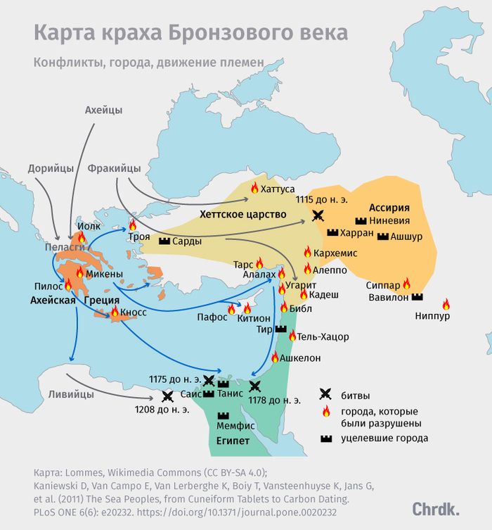 За относительно короткое время — в древнеегипетских надписях зафиксирован промежуток от 1207 до 1177 года до нашей эры — весь прекрасный бронзовый мир растворяется. Торговые связи рушатся. Из известных нам царств бронзового века в более-менее нетронутом виде остается Египет, который теряет контроль над Сирией и Палестиной. Вавилон и Ассирия сохраняют разве что локальное значение. Исчезает микенская цивилизация. Разрушена Троя.