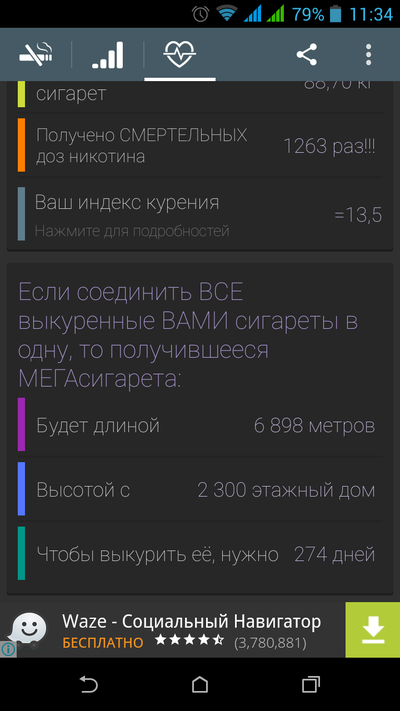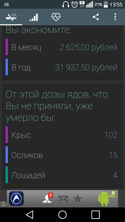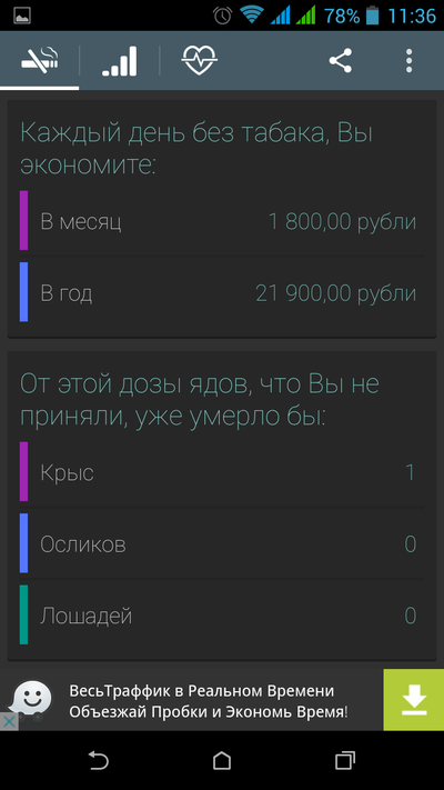 Программка на телефоне простенькая показывает сэкономленные средства и пользу. Плюс количество крыс, осликов и лошадей, которые "погибли бы" от дозы никотина, которую я не получил за время отказа от курева. Впрочем, просто можно задуматься о здоровье и последствиях.