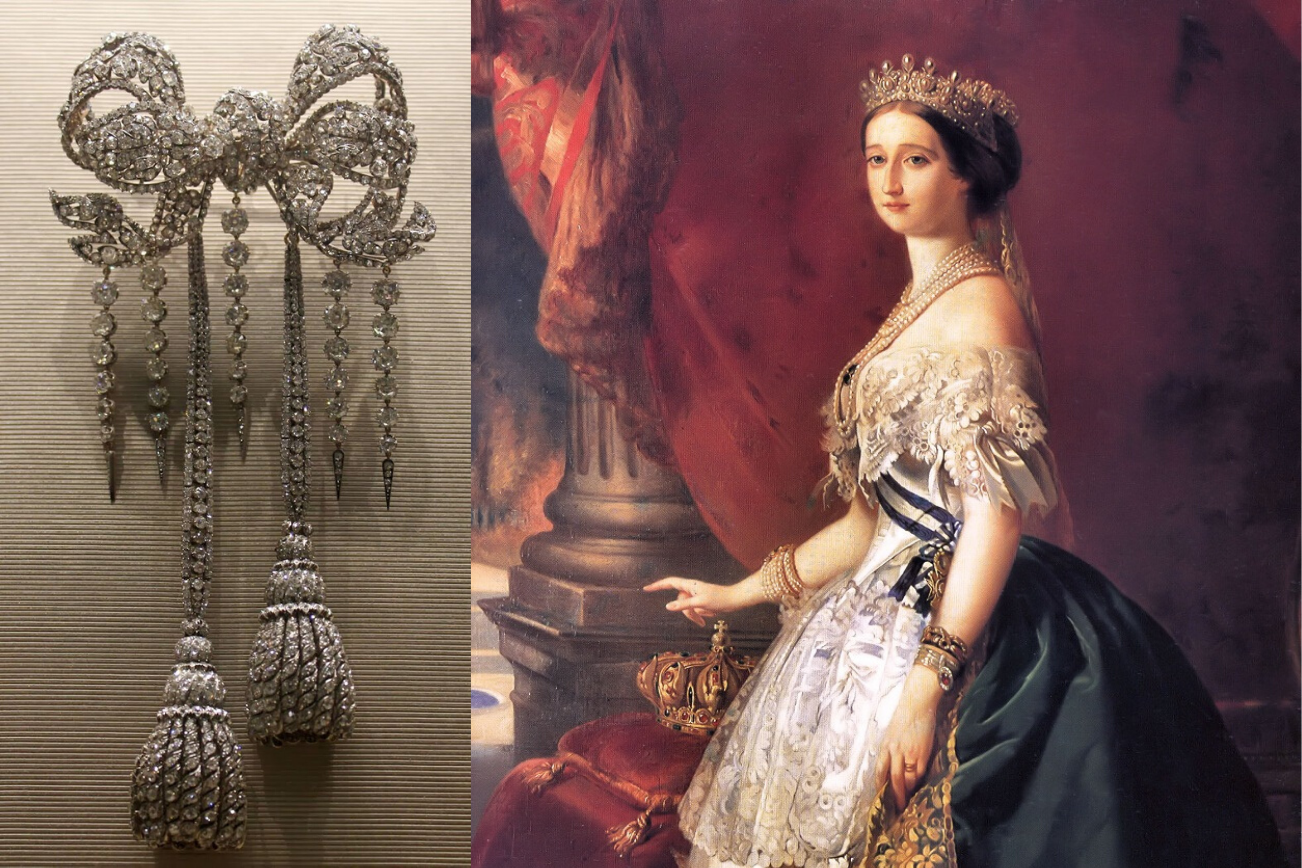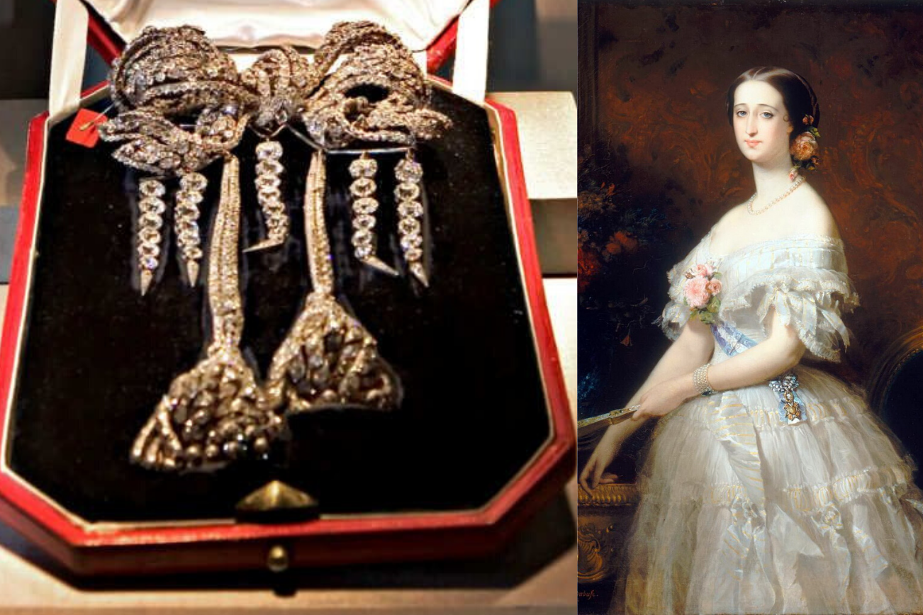 Брошь Евгении когда-то была центральным элементом бриллиантового пояса, созданного придворным ювелиром Франсуа Крамером ко Всемирной выставке в Париже 1855 года. Позже Евгения попросила разобрать пояс и сохранить лишь бант с кисточками, состоящий из 2634 бриллиантов общим весом более 140 карат. Именно этот бант и стал её корсажной брошью.