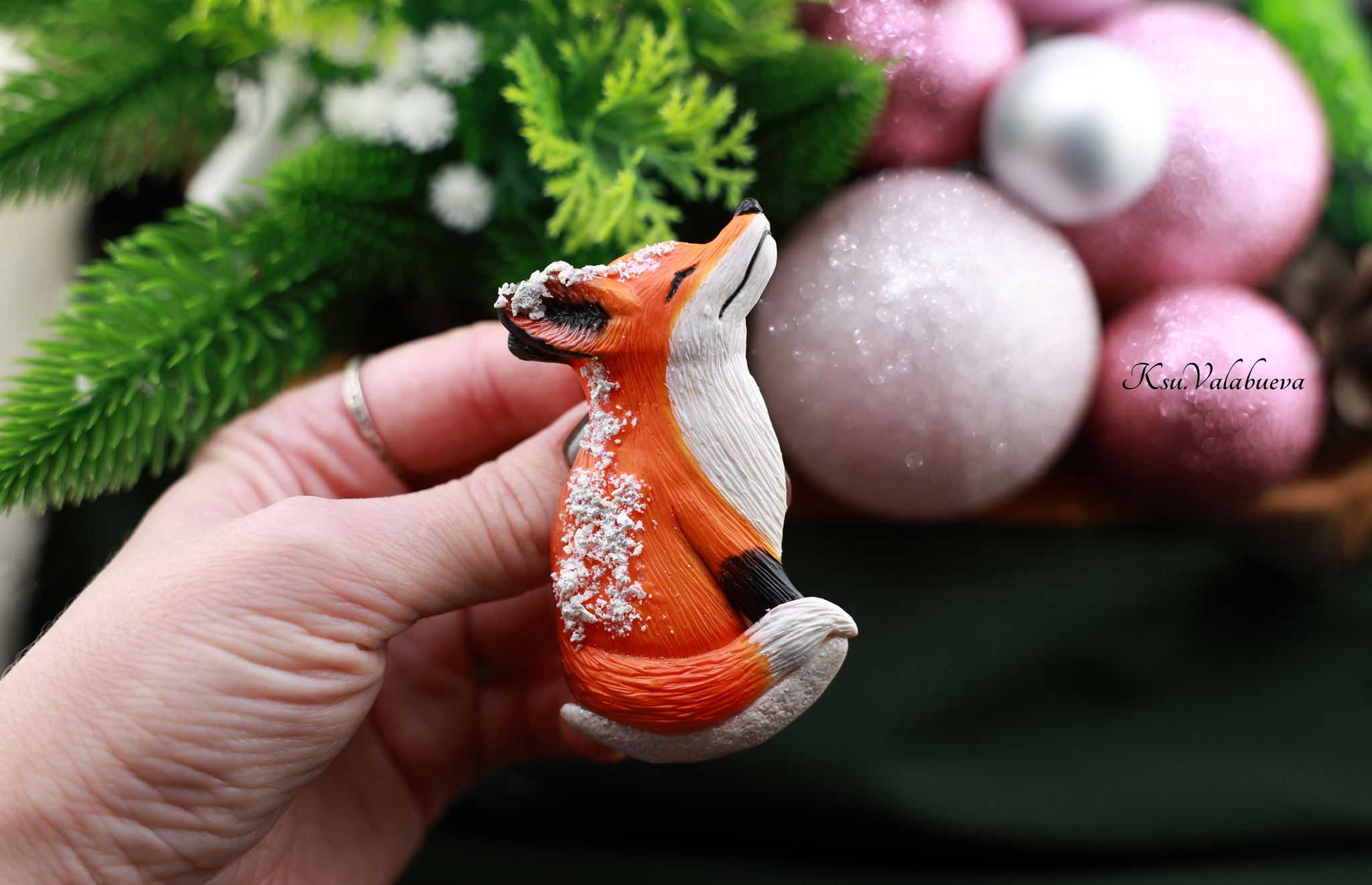 Брошь Лисичка и снег, выполнена полностью вручную из запекаемой полимерной глины.