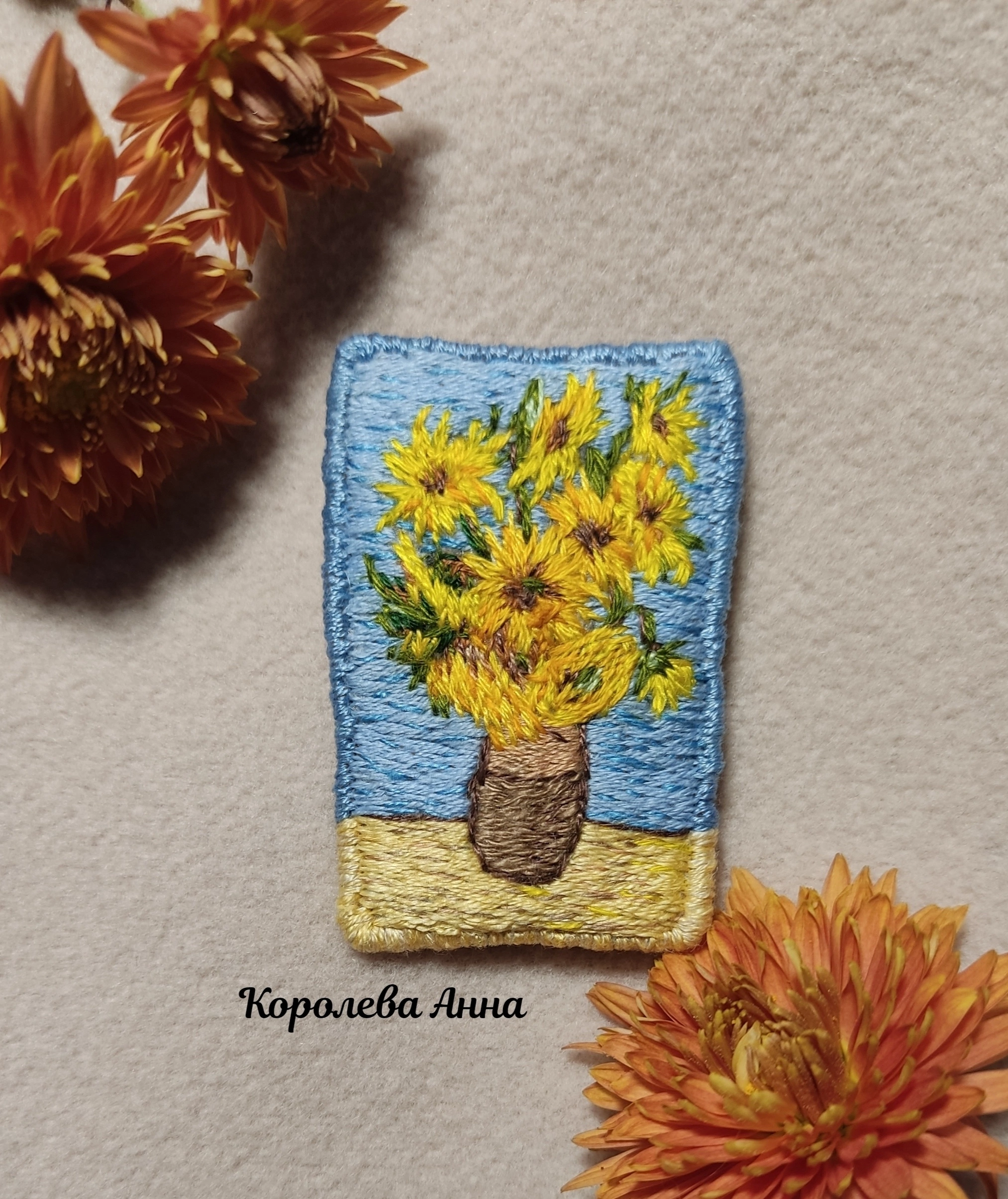 Брошь вышитая гладью вручную. На работу вдохновила знаменитая картина Ван Гога. Размер 3-4 см