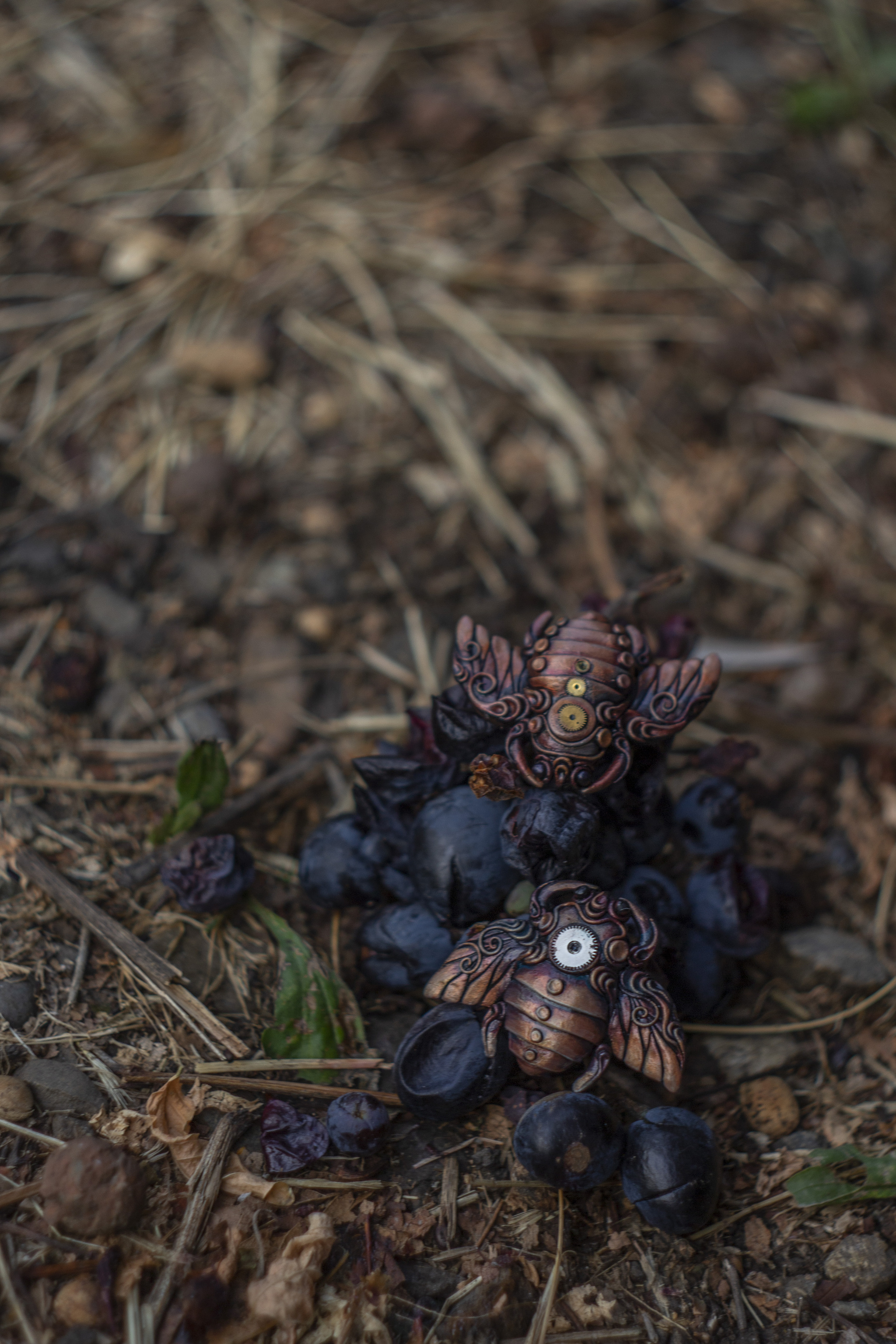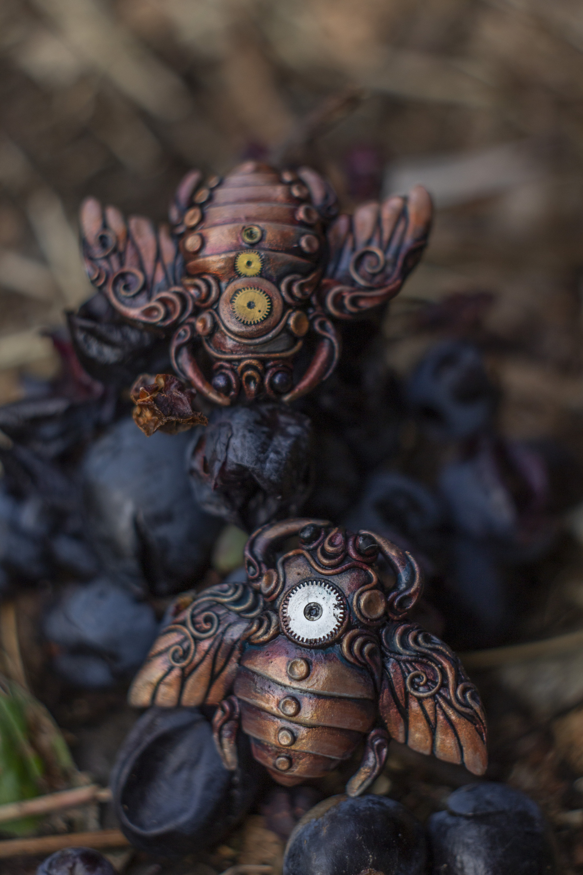 Полимерная глина, акрил, пастель сухая, шестеренки, лак.