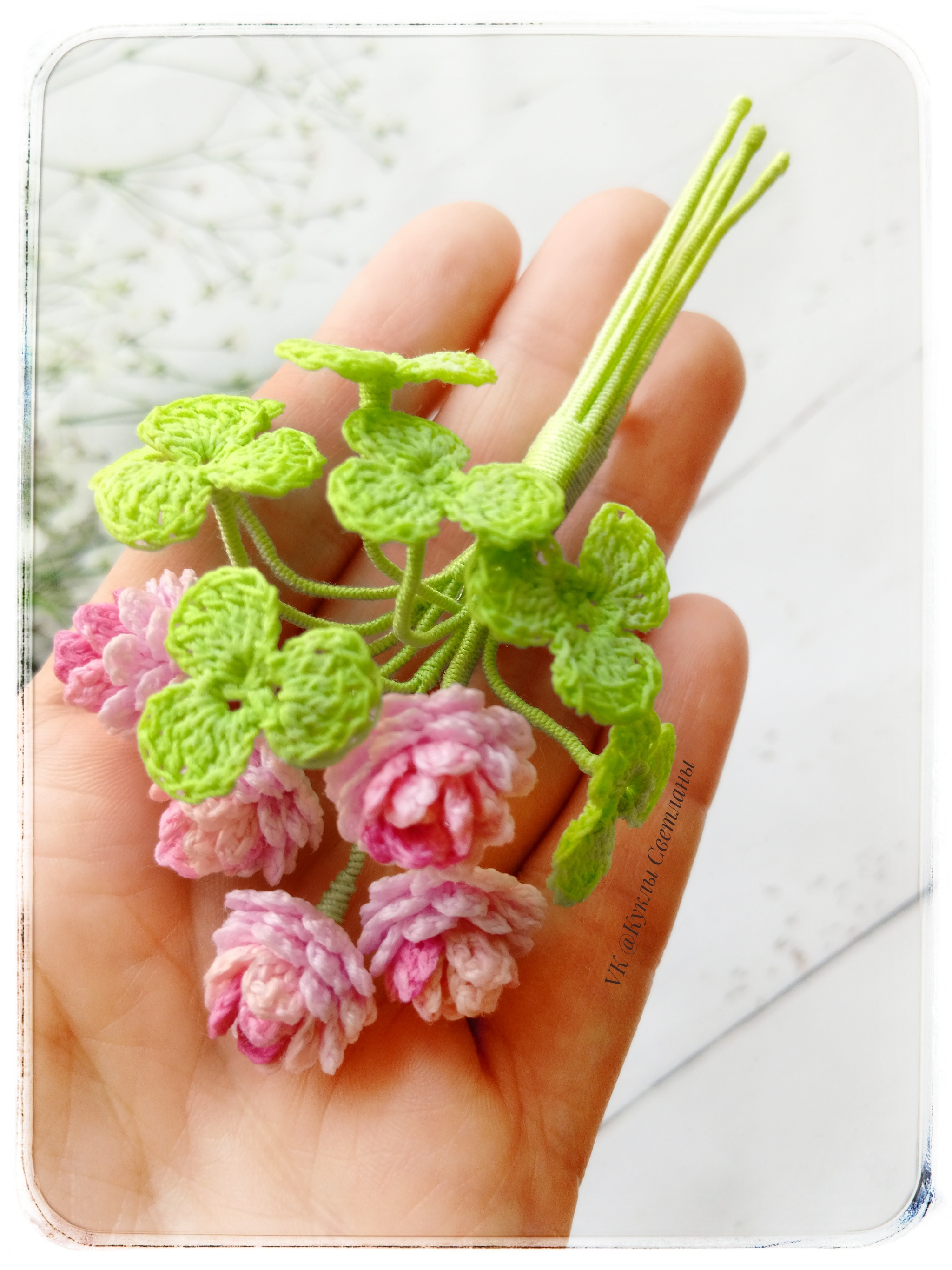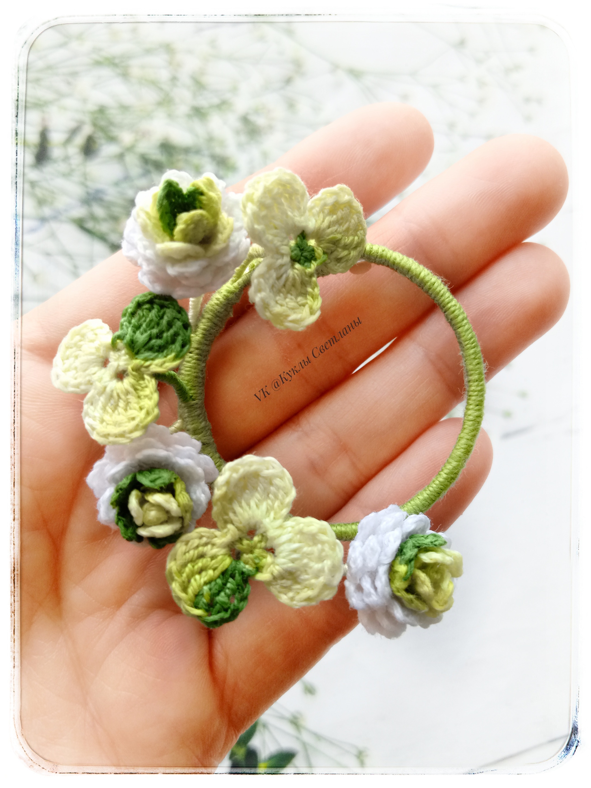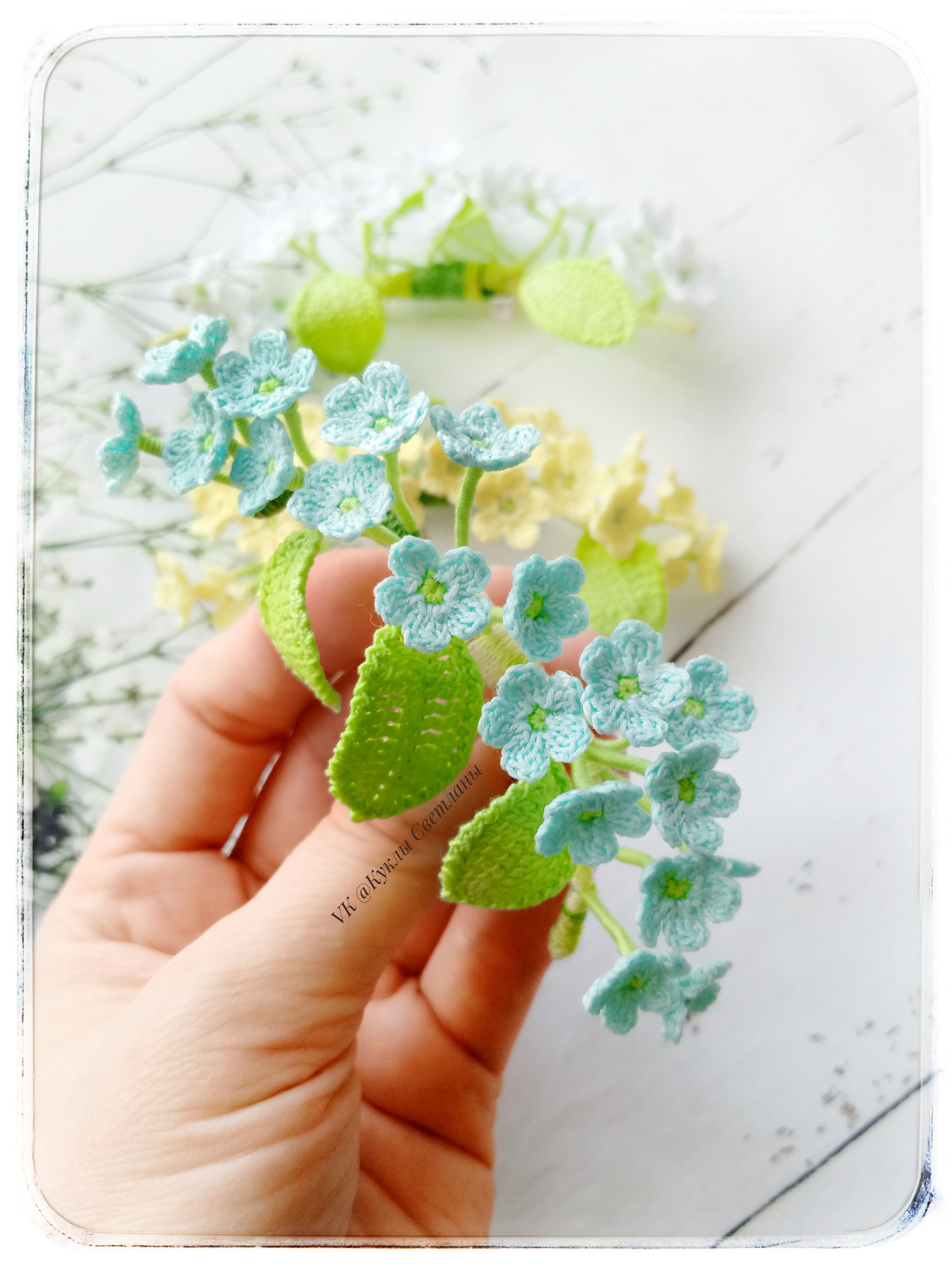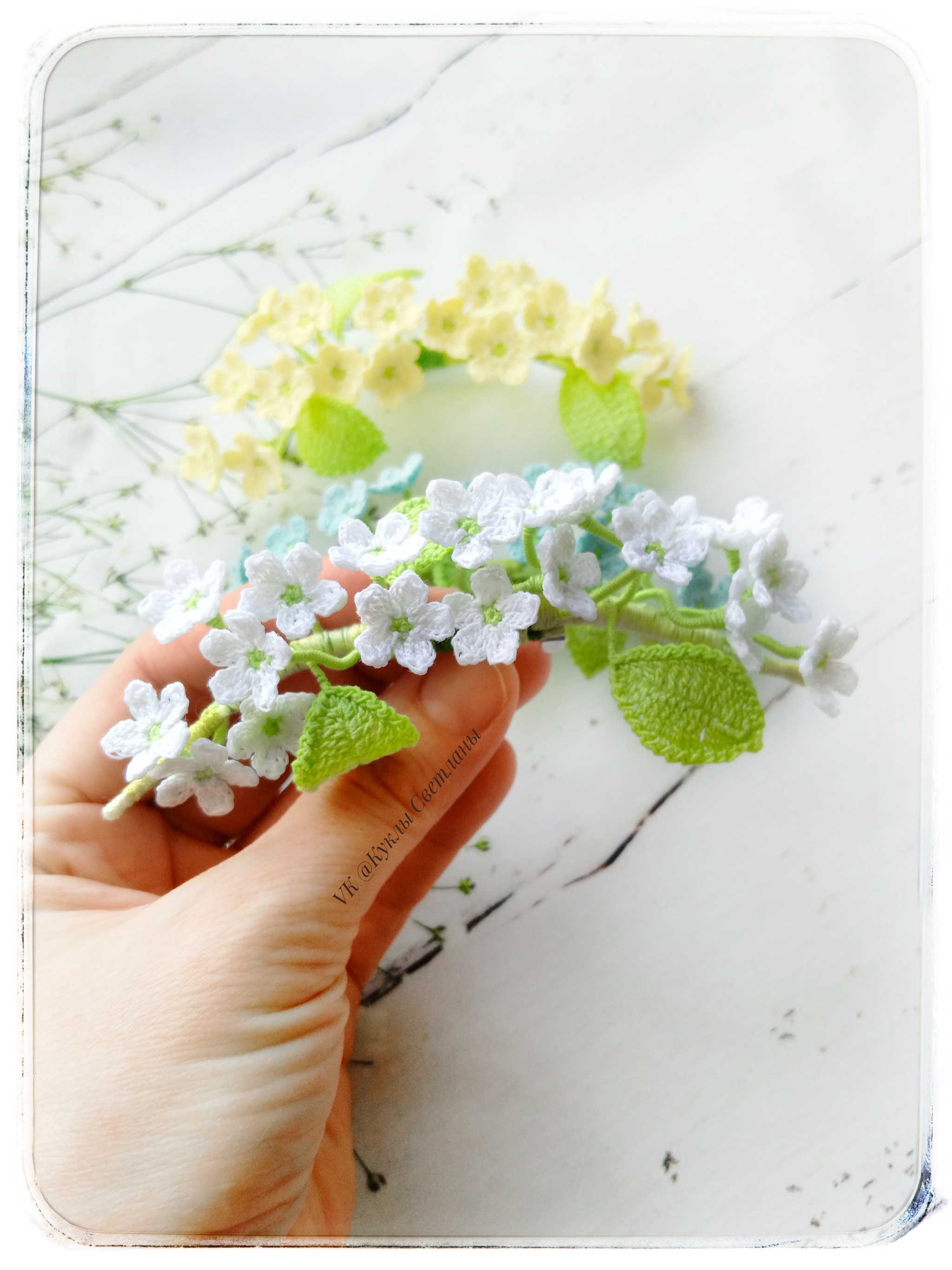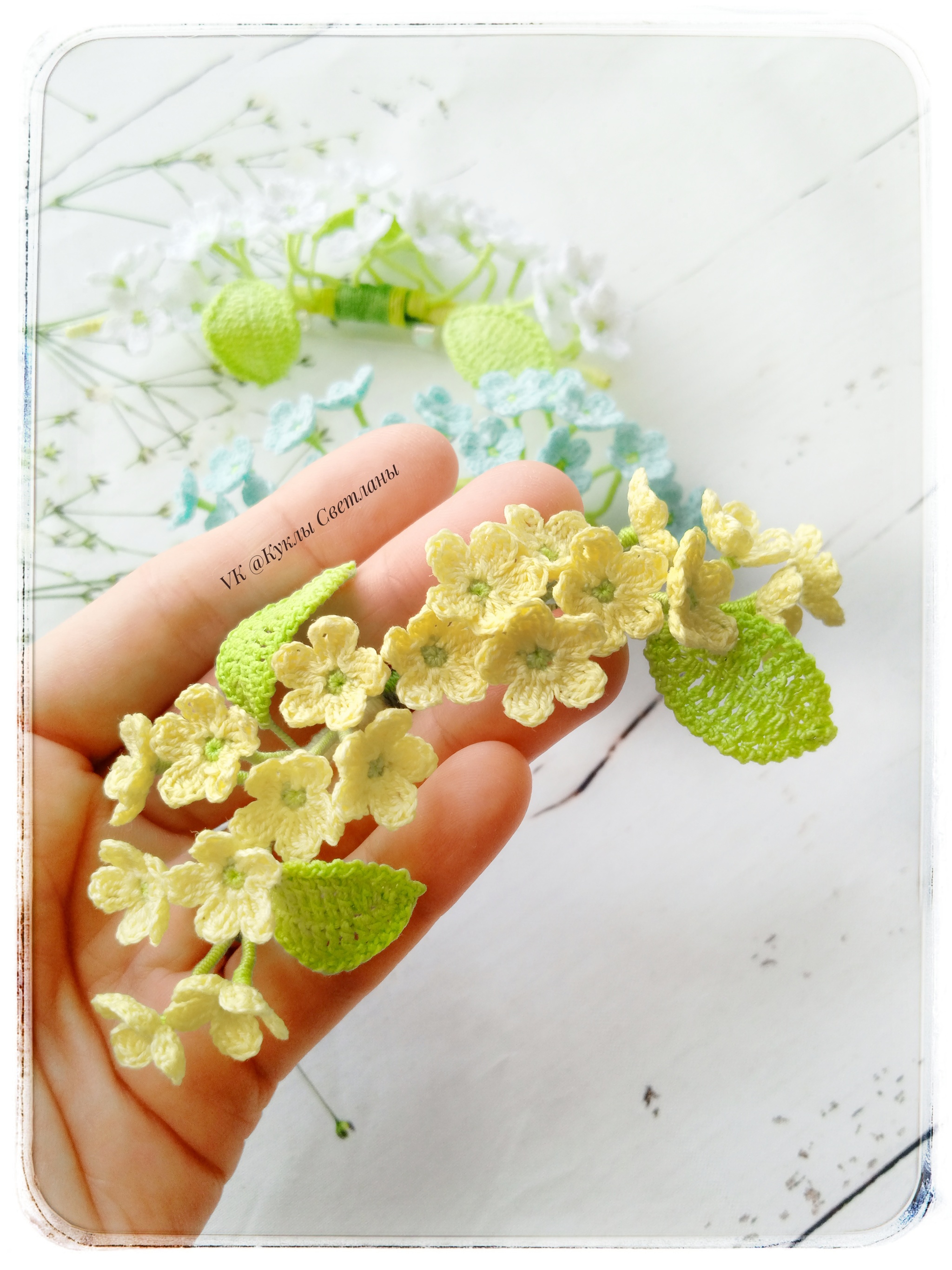 Броши связаны крючком из тонкой хлопковой пряжи. Каждый листок и цветок обработаны слабым клеевым раствором. Также в каждой веточке проволочный каркас. Брошь хорошо держит нужную форму, очень лёгкая, невесомая. Размер брошей от 7 до 13 см.