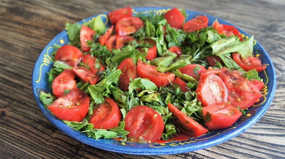 Не крупно нарезать помидоры. Очистить и нарезать огурцы. Помидоры и огурцы добавить к зелени.