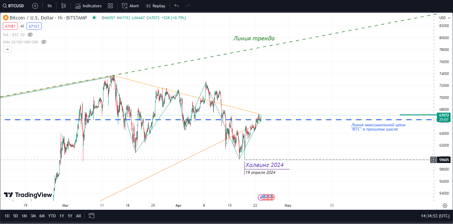19 апреля состоялся Халвинг Биткоина, на 5 дней раньше чем я планировал, цена сходила вниз до 59642тыс. и начала востанавливаться. На данный момент мы находимся выше ATH (максимальная цена) предыдущего цикла.