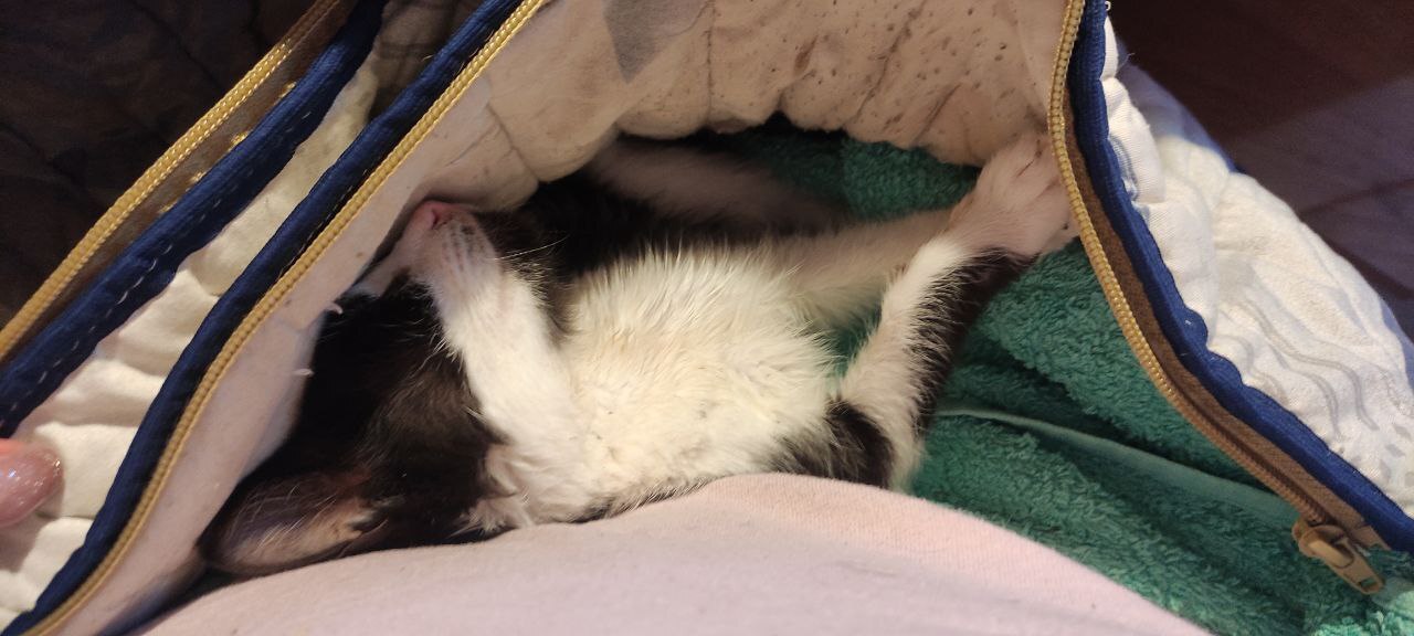 Но кушает котя охотно, пьет тоже. Пытается шастать по дому, даже потерялся вчера, уснув в ящике под кроватью (и обосравшись там, что сладкому сну это не помешало).