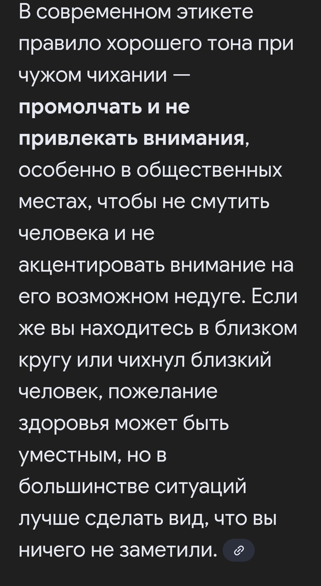 Меня одного дико раздражают люди, которым когда ты говоришь "Будь здоров!" потом говорят что видите ли, "Я вапщета не чихал(а) а кашлял(а)!". И что с этого? Почему я не могу пожелать человеку здоровья который кашляет а не чихает? Или я обязан желать здоровья только тогда когда он чихает? Или же я в таком случае должен сказать "Поперхнись" чтобы восстановить баланс? Чего вы блыть хотите добиться этой фразой? Раздражает сильно, скорее нахуй таких слать буду