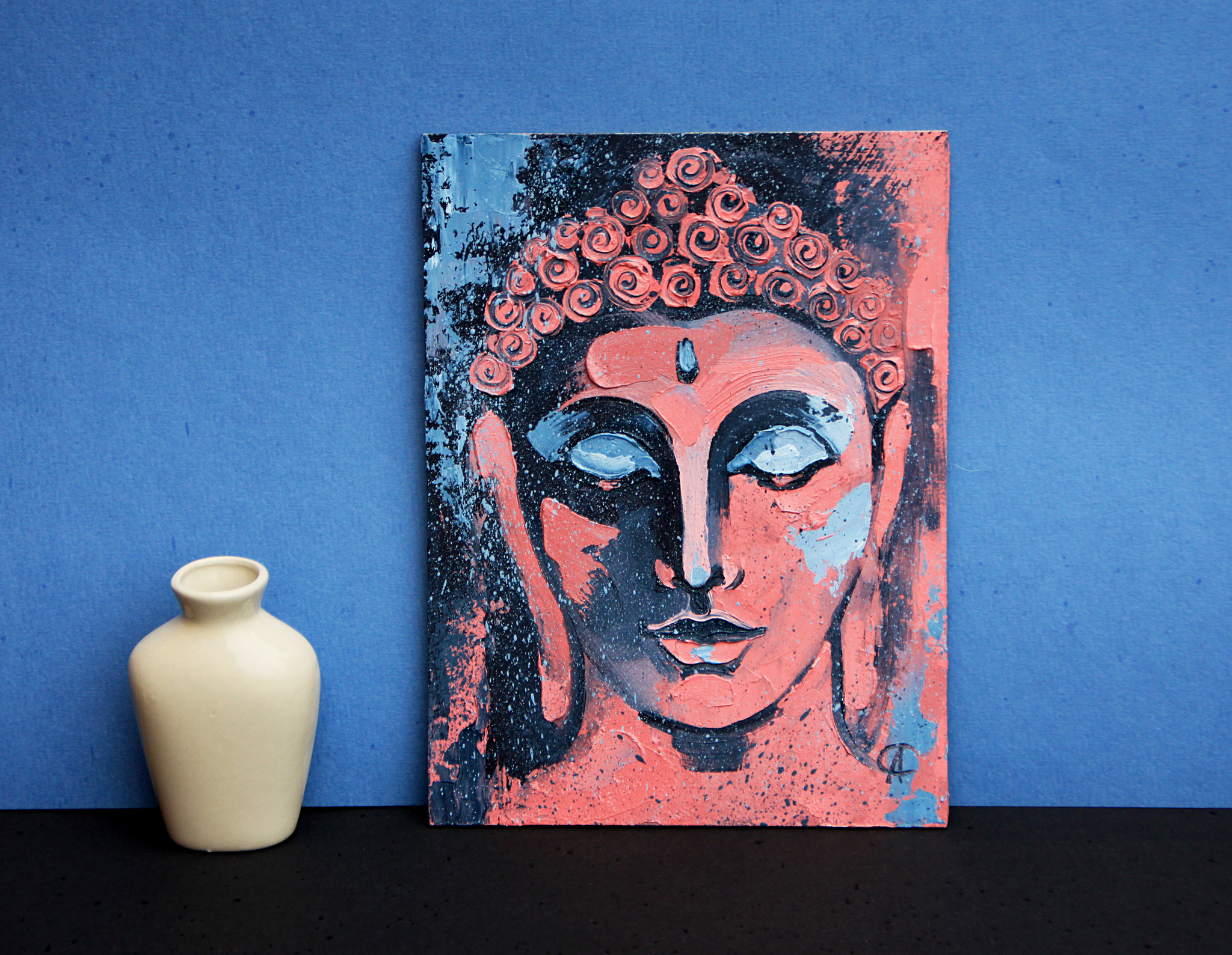 «Будда. Коралловое сияние» — небольшая картина маслом, воплощающая гармонию духа и цвета. Лаконичная композиция сосредотачивает внимание на лице, передавая ощущение внутреннего света и умиротворения.