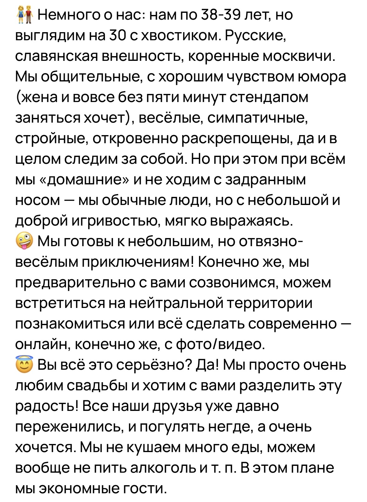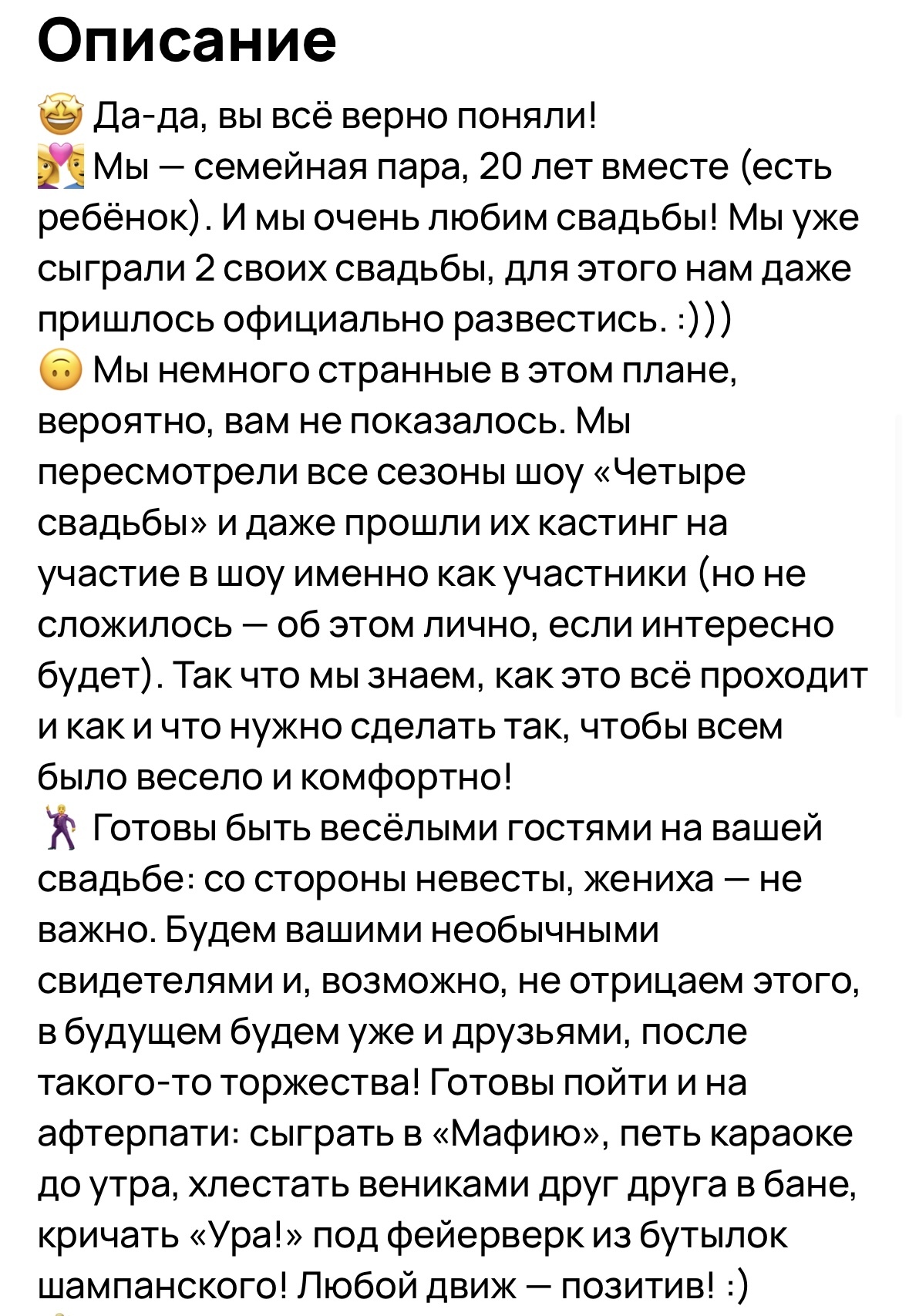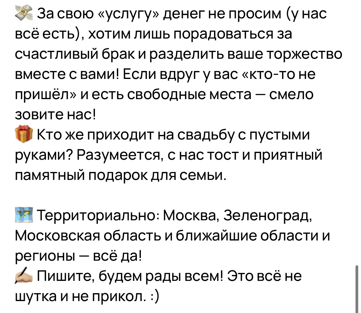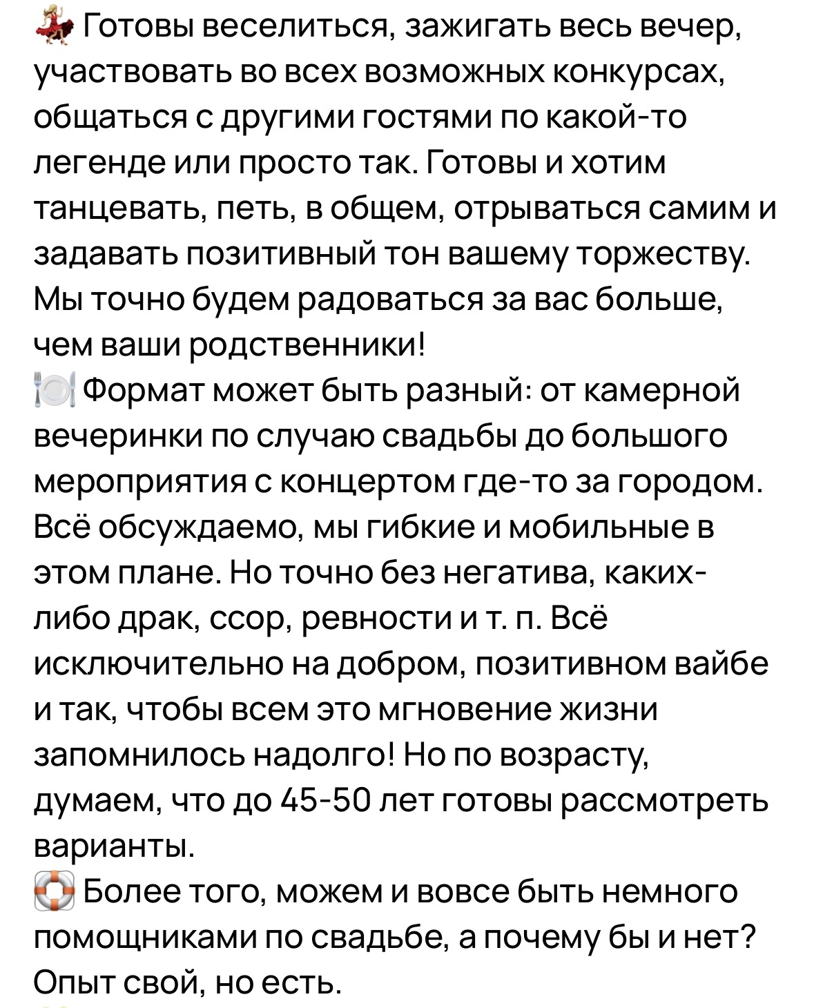 🙏🏼 Был бы признателен, если сила Пикабу поможет найти по-настоящему интересную свадьбу и мы сможем повеселиться все вместе с молодыми от всей души. Ведь мы правда этого хотим!