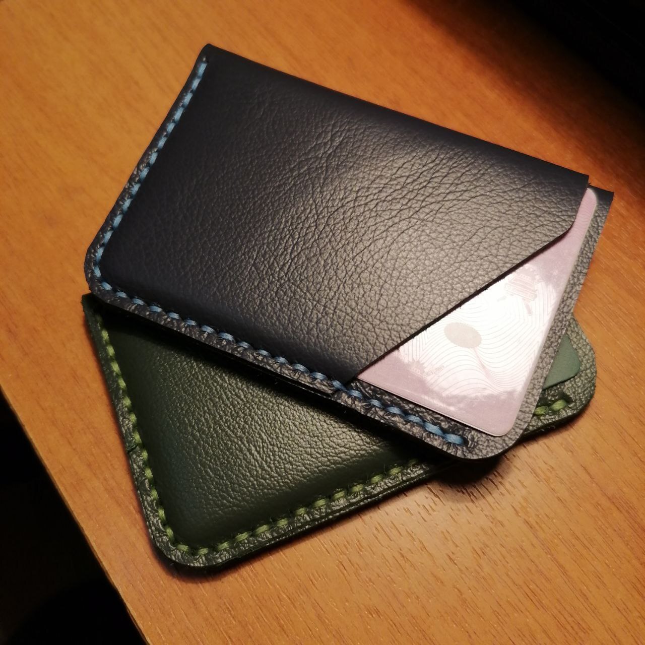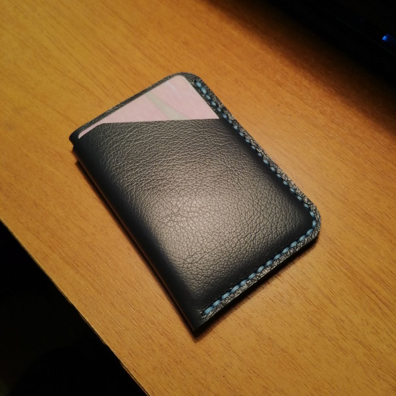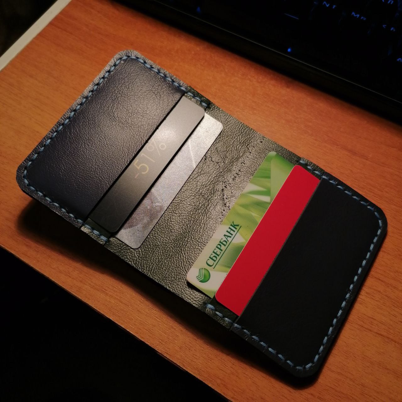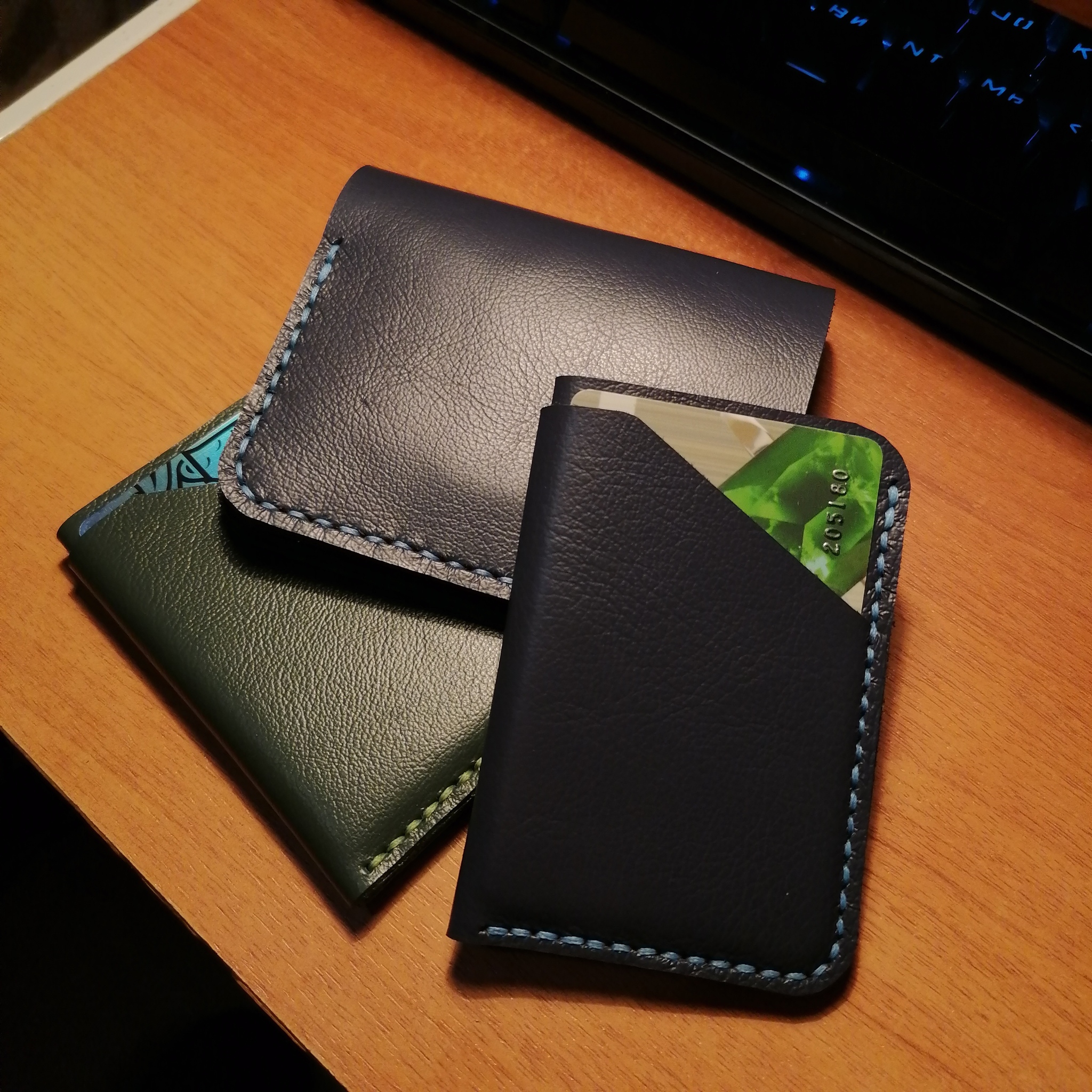 Минуту спустя, взгляд падает на 2 оставшихся куска зелёной и синей кожии. Запускается мыслительный процесс. Нужно что-то масштабнее. Кошелёк. Тьфу. БИФОЛД. Выкройки найдены. Алиса вещает русский пост-панк на громкости 5. "Давай скорее вези меня туда где тени от пальм" кричит мне солист группы Второй Ка. Процесс прокалывания отверстий шилом затягивает с головой. Здравый смысл шепчет "псс парень, купи пробойники". "Пфф, с пробойниками любой может" парирую я. Сшивание заготовок по ощущениям длилось несколько минут, хотя по факту около часа. И вот возвратный стежок выполнен, нитки обрезаны и запаяны. Барабанная дробь...