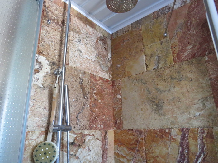 Но продолжим освещение эксплуатационных характеристик. Как видите, стенки душевой кабины также облицованы пористым травертином. Три года - пока полет нормальный, и даже намеков нет на необходимость какого-либо ремонта. Мыльная пена (тщетно пытаюсь придумать, воздействие каких еще веществ может ждать камень в душевой кабине, и не могу придумать) ровно никакого эффекта на камень не возымеет. Он не темнеет, не светлеет, впитывает в себя воду и высыхает без всяких на то дополнительных ухищрений. Например, чтобы стенки высохли, не нужно открывать дверь кабинки на проветривание.
