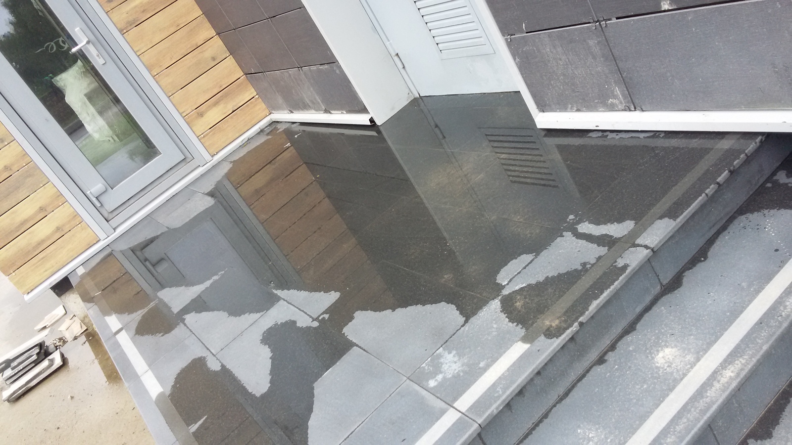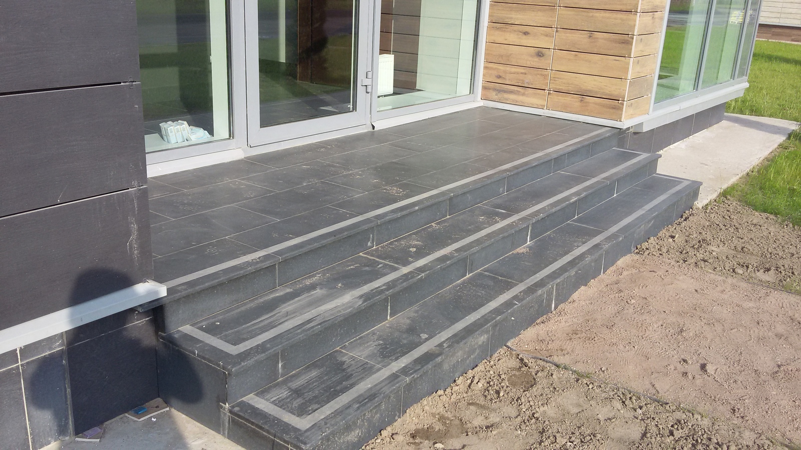 А вот еще один объект. Бесконечные крыльца и входные группы. А вообще, хотите мое мнение? Никогда, ни при каких обстоятельствах не выбирайте лощёный черный гранит (в данной ситуации Габбро) в уличном использовании, где часто ходят люди! Эти крыльца держат чистоту.. Ну, минут 5-10 =) Может быть, когда строительные сапоги сменятся чистыми кроссовками и туфлями, пачкаться такой камень будет меньше, но не факт, не факт. Крыльца получились очень маркими, но как ни странно, шикарно подошли в цвет цокольной части дома, облицованной плиткой.