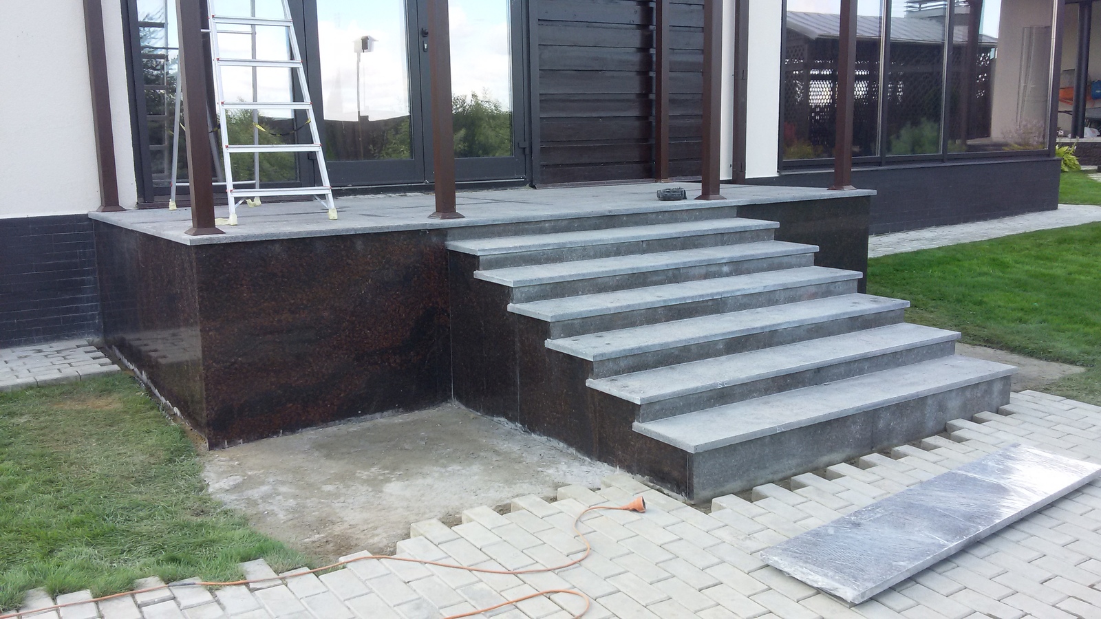 Дымовский гранит. Необычность в том, что площадку мостили плитами 1х1 метр, и подступёнки делали термообработанными, в цвет ступеней. Вроде бы фигня, но практически все выбирают в подступёнки полировку, поэтому работать было интересно хотя бы даже ради этого. Ну, а командировка и ночь в шикарном спа-отеле с дороги в подарок от заказчика были ой как кстати =))