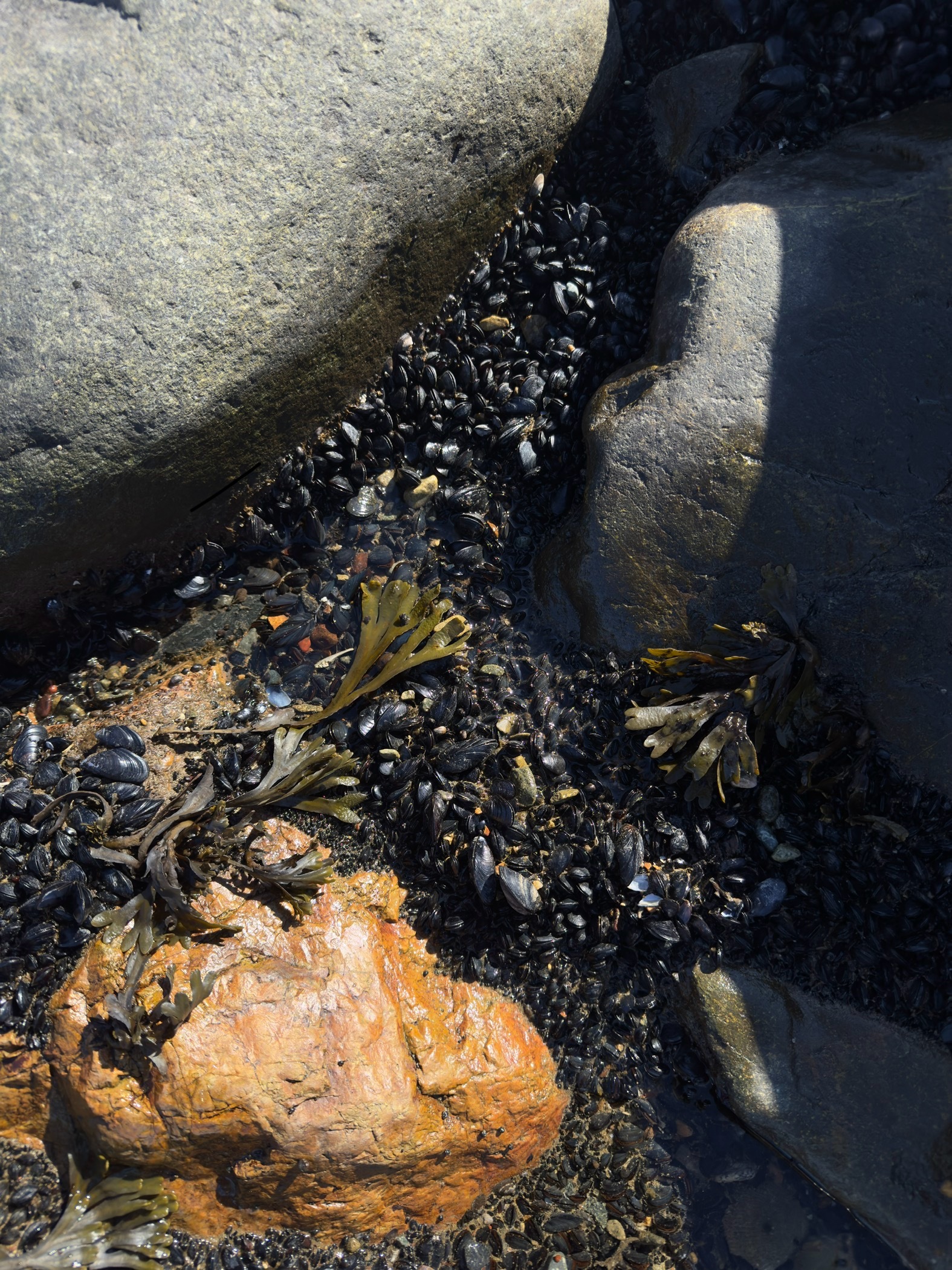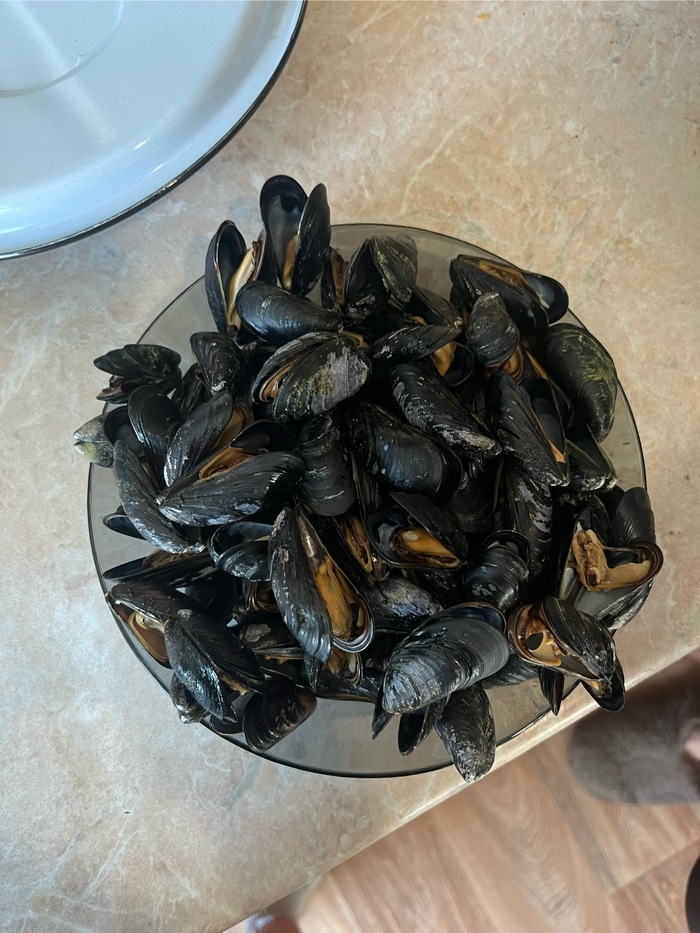 Пару дней назад мы отправились в бухту за «ужином». На камнях было много мидий, хотя большинство совсем мелкие, чуть больше ногтя. Андрей, надевший вейдерсы, добыл несколько крупных экземпляров. У меня такой экипировки нет, поэтому я сменила обувь на бродни прямо на берегу и, словно робот, методично обследовала прибрежную зону, и тоже отыскала пару крупных раковин.