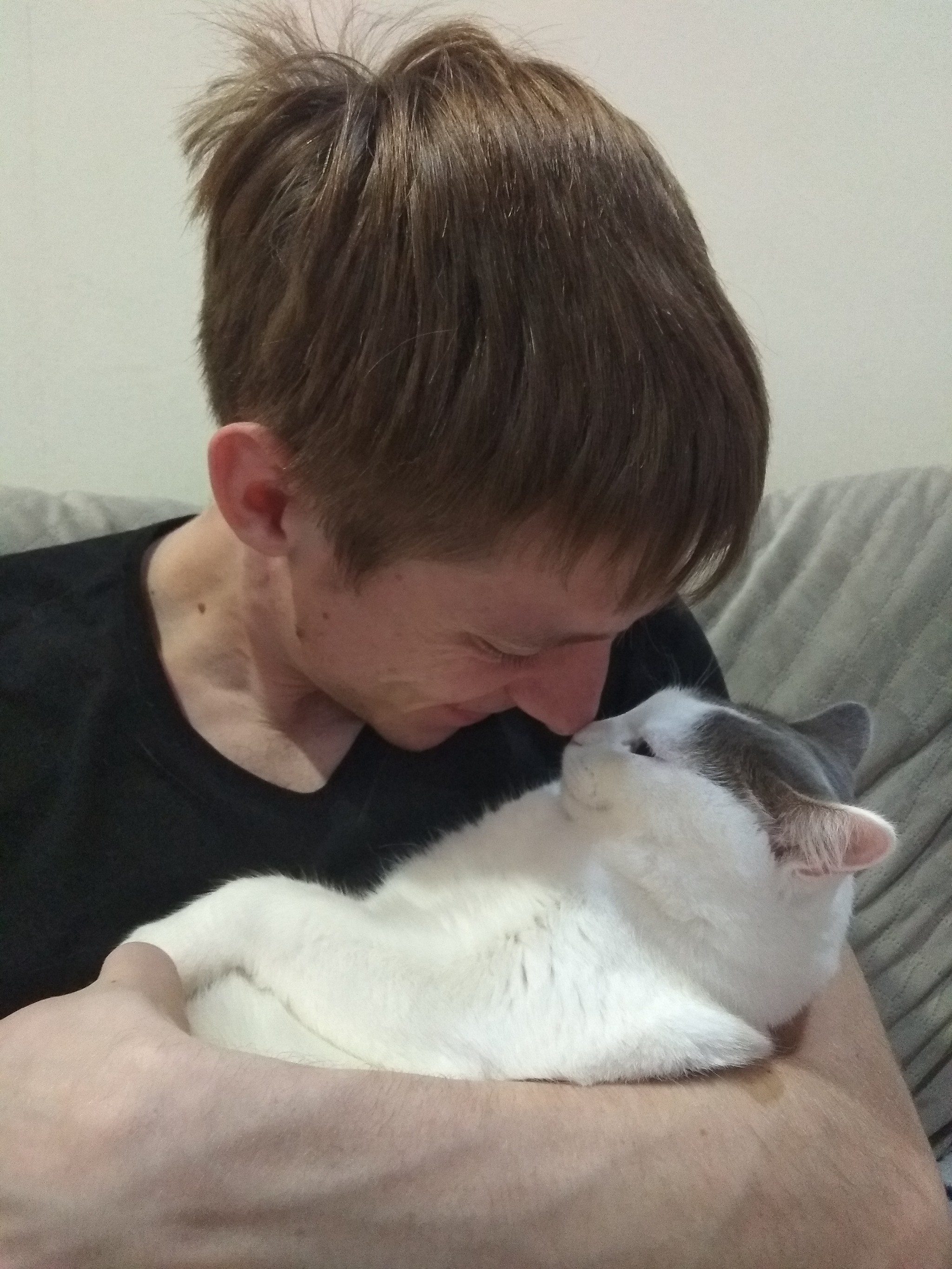Суфля до сих пор каждую свободную минуту приходит и оккупирует коленки/грудь/живот (в зависимости от позы) или на крайний случай ложиться рядом, и начинает ластится, мурчать. Прибегает по первому зову, готовая принять внимание. Безмерно мягкая и ласковая кошка, что не укладывается в голове, как такую можно обречь на выживание в новогодние морозы..