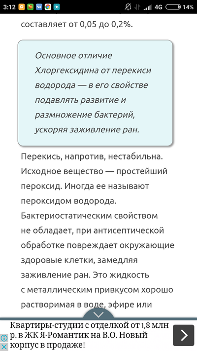 Перекись водорода не имеет антисептических или заживляющих свойств. Ее функция - растворение засохшей крови. И больше ничего. Кроме этого она, как и хлоргексидин, сушит кожу и даже обжигает. И это даже в самой меньшей концентрации (1%), не говоря уже о больших. Поэтому ее использовать не стоит.