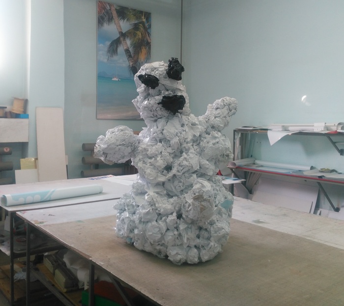 Дальше опять веселье. Был большой заказ, связанный с изготовлением наклеек и плоттерной резкой. При зачистке наклеек из самоклеящейся плёнки деловая часть остаётся на подложке, а окружающая её лишняя плёнка удаляется. Образуется некоторое количество отходов, из которых мы слепили плёнковика.
