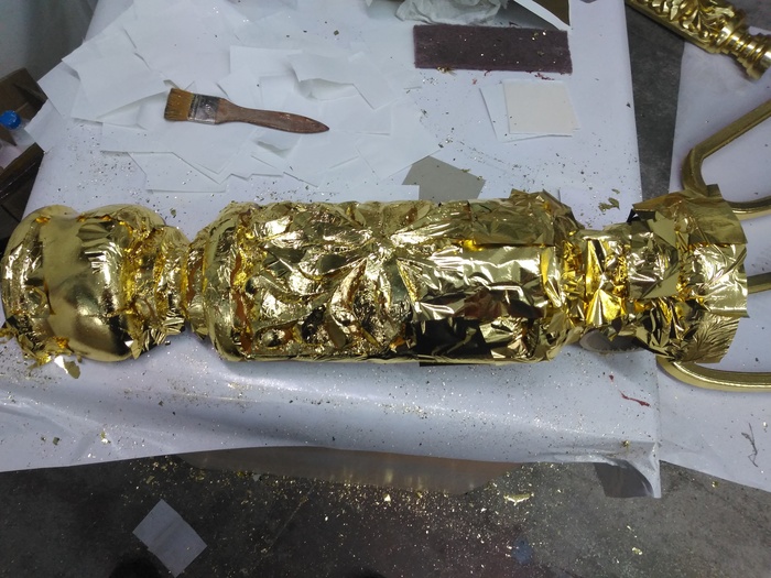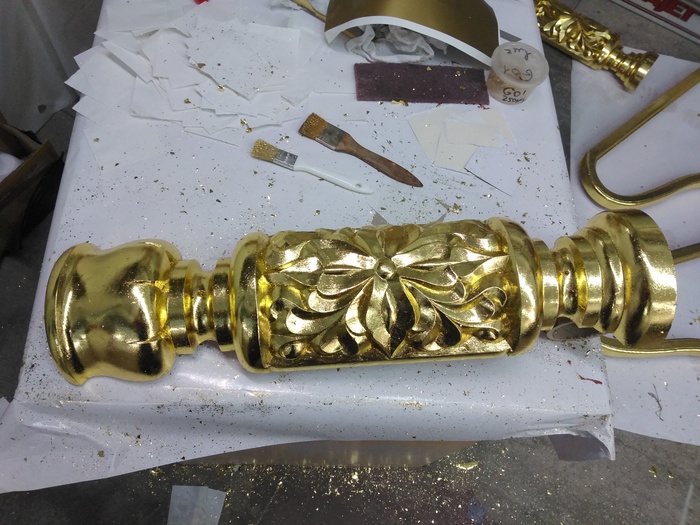 После первоначального нанесения, поталь приминается к клею обычной кисточкой. В труднодоступные места поталь попадает после обметания. Обметание, опять же, производится кисточкой, которой мы и удаляем излишки потали, приходящиеся на нахлёсты. Если обмёта не хватило, то есть банка с мелкими кусками потали, откуда мы щедро сыпем в незакрытые места.