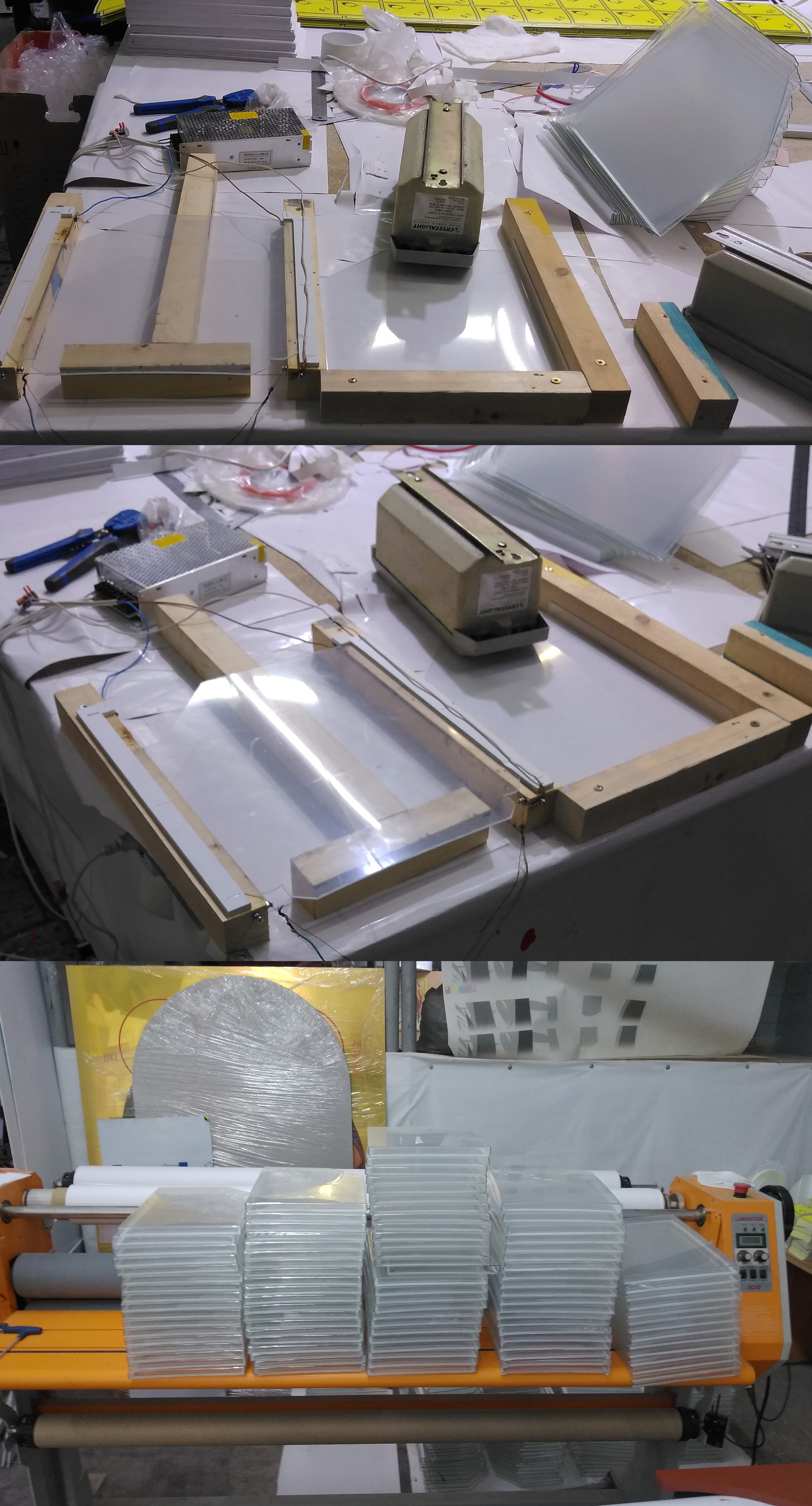 Три нихромовых струны одновременно греют три клапана кармана. Потом разогретый карман помещается в кондуктор, где остывает, пока греется новый карман. На нижней картинке не все карманы, за ламинатором виднеются ещё залежи. А если присмотреться, то можно увидеть икону. О церковных делах пойдёт отдельный разговор.
