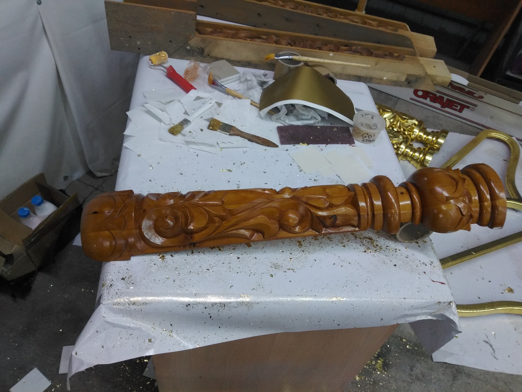 Также мы производили золочение элементов иконостасов. Сначала изделие покрывается клеем.
