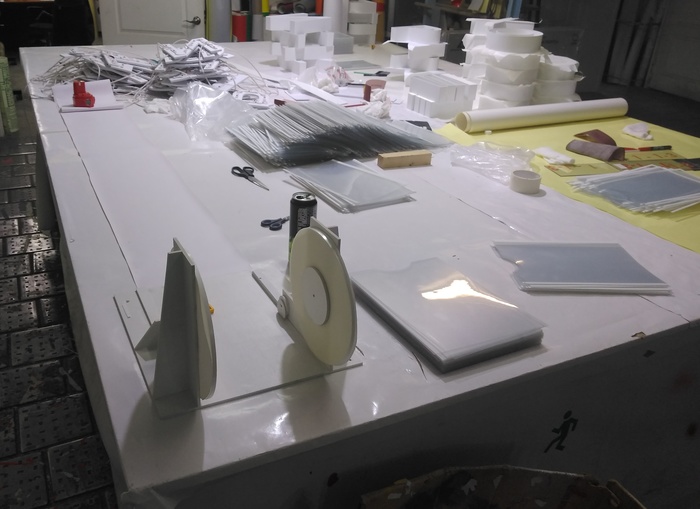 Уже знакомый краешек стола трэш-изобретательства. На этот раз приспособа, которая наносит двухсторонний скотч на плоские карманы для стендов. Тоже значительно ускоряет процесс.