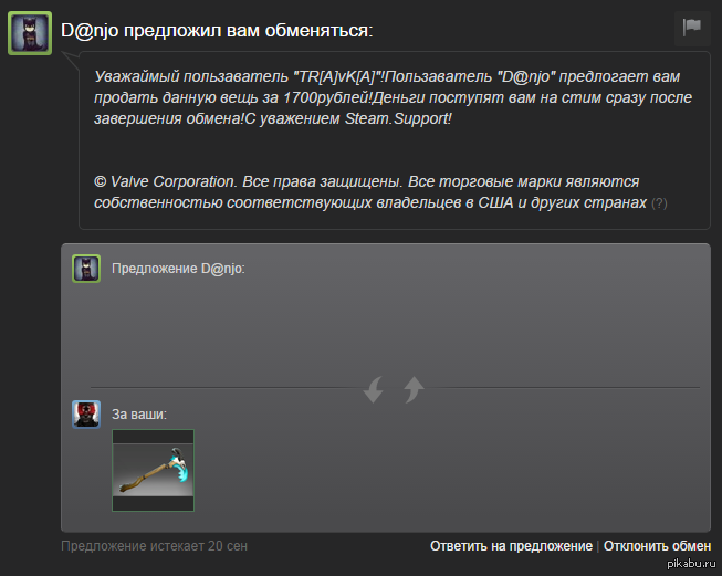 pluxa Будьте аккуратны! (поднимите в топ что бы все видели) 11 лет назад Хотел купить хекс за реал, все это время убеждал все четно и тд. Я не уступил, позже пришло вот такое предложение обмена и конечно же очередная попытка на**ать [моё] Дота Стим Обман Трейд