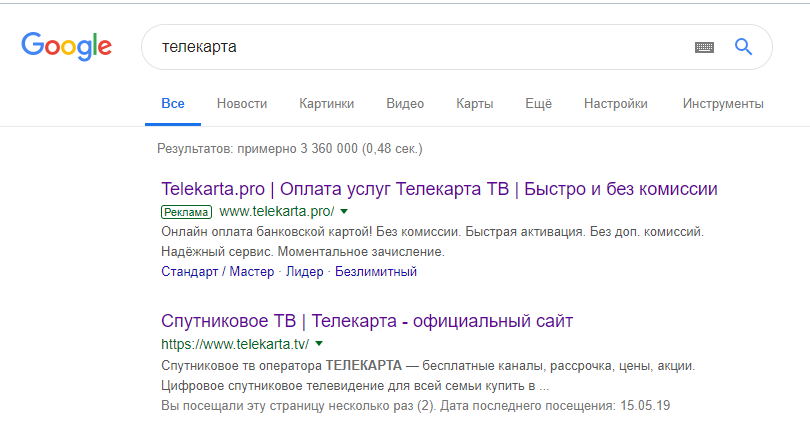 В качестве оператора спутникового ТВ у меня используется "Телекарта", я ленивый, поэтому предпочитаю платить через интернет. Сделал себе чай, запустил комп, открыл Яндекс, худо-бедно разлепил глаза, вбиваю "телекарта" и иду по первой ссылке, вбивая номер карты доступа.