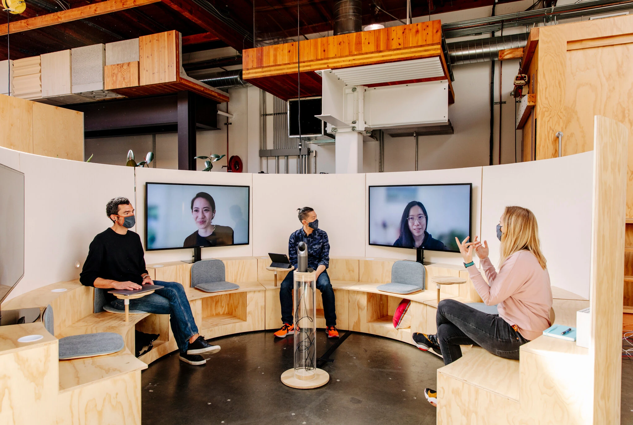 - Вторая причина - внедрение "Командных капсул" - мест, где могут собираться офлайновые и онлайновые члены команды, максимально похожих на обычное общение (онлайновые выводятся каждый на свой экран). Выглядит это, будто люди и больщие экраны сидят вокруг костра, всем видно всех. Они имеют другой формат и вид, чем обычные переговорки и занимают больше места.