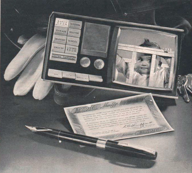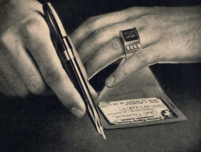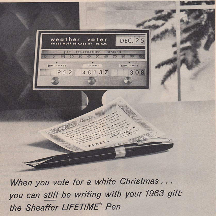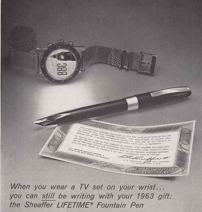 В начале 1960-х компания Sheaffer выпустила новую линейку перьевых ручек Sheaffer Lifetime и по этому поводу запустила оригинальную рекламную кампанию. В каждой рекламе демонстрировался какой-нибудь гаджет из достаточно отдаленного будущего, с лозунгом в духе "в будущем вы будете пользоваться вот такими штукам, но наша ручка настолько совершенна и надежна, что все еще будет писать". Sheaffer давали пожизненную гарантию на свои ручки, и в рекламе заглядывали в будущее лет на 40, то есть в 2003-04 г. Теперь это будущее уже наступило, а значит, можно сверить часы.