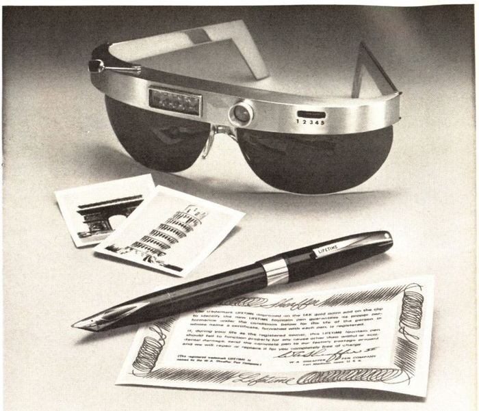 В 21 веке вы будете ездить в отпуск вот в таких солнечных очках со встроенной фотокамерой! А подписывать привезенные фоточки будете, конечно, ручкой Sheaffer, купленной еще в 1963-м.