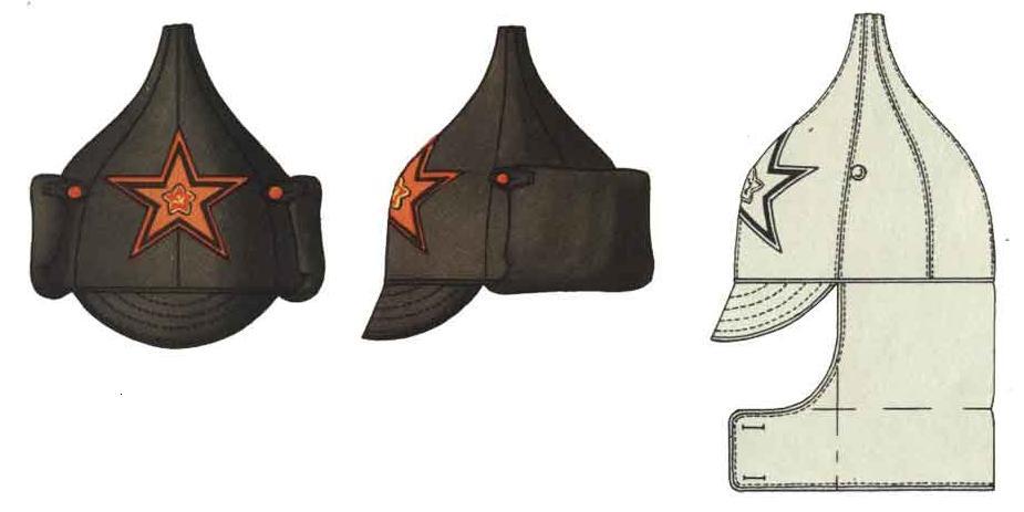 Буденовка создавалась для холодного времени года (хотя с апреля 1919 г. по февраль 1922-го числилась уже всесезонным головным убором). Ее сложенный вдвое, отогнутый вверх и пристегнутый на две пуговицы по бокам колпака назатыльник можно было опустить и застегнуть на две пуговицы под подбородком, закрыв уши и шею. Спереди нашивалась суконная пятиконечная звезда цветом по роду войск. У пехоты - малиновая, у кавалерии - синяя, у артиллерии - оранжевая (с февраля 1922 г. черная), у инженерных войск - черная, у броневых сил (будущих автобронетанковых войск) - красная (с февраля 1922 г. черная), у авиаторов - голубая, у пограничников - зеленая, у конвойной стражи (с февраля 1922 г.) - синяя.