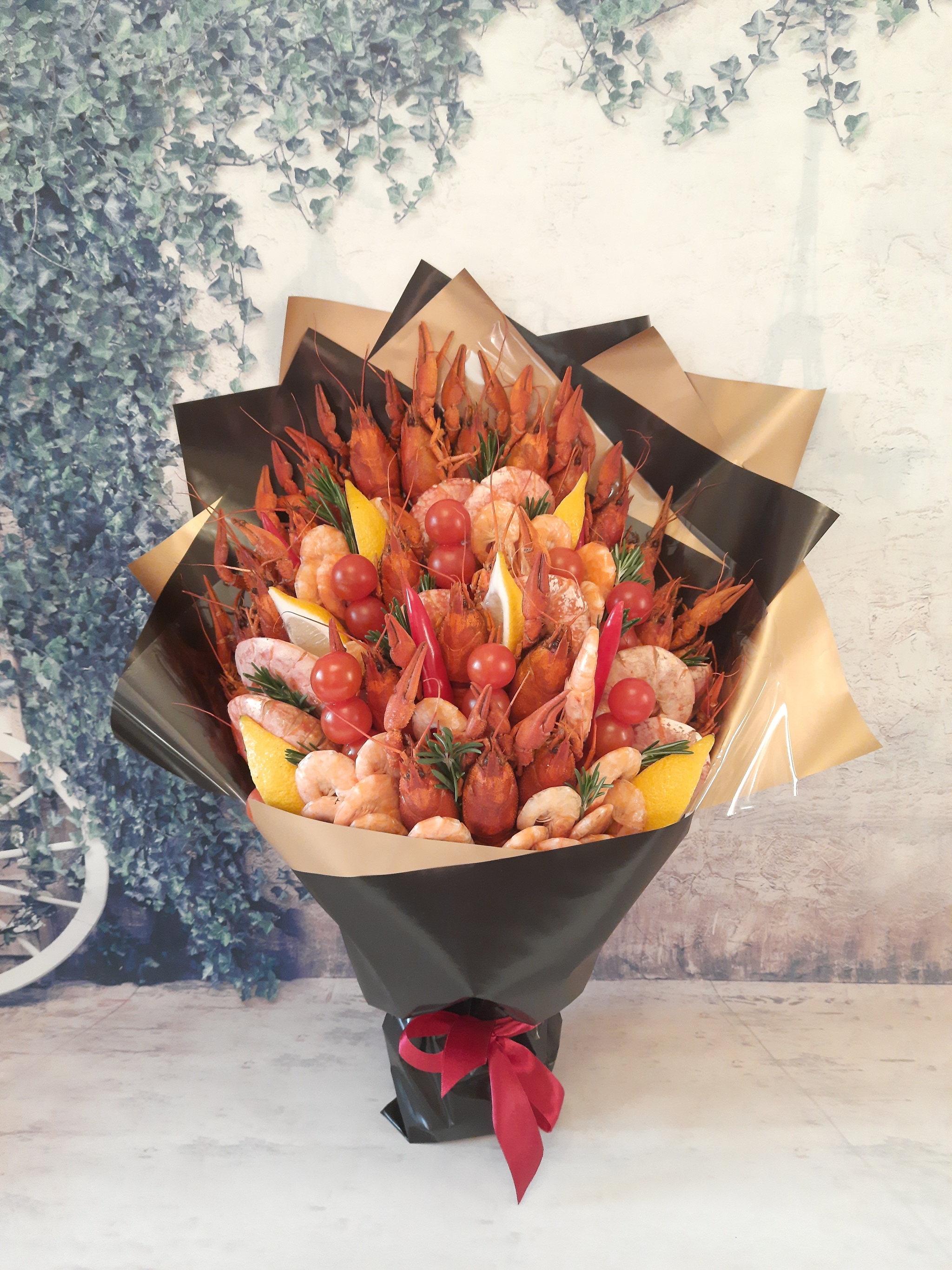 В букете раки, аргентинские лангустины, королевские креветки, перец чили, черри, лимон, розмарин.