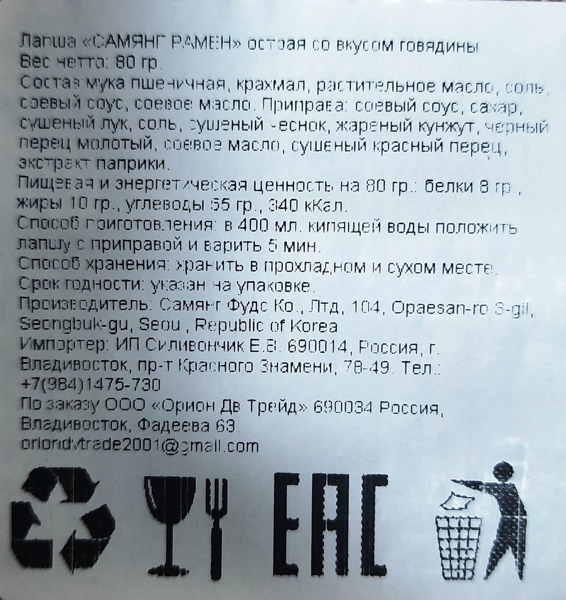 Доброе утро, друзья! Рад приветствовать всех этим прекрасным теплым и солнечным весенним утром. Спешу предоставить вам обзор очередной лапши с пылу с жару. Сегодня я продолжаю знакомиться с новой для меня серией лапши от Samyang. Ранее мной был опробован Jjajang Ramen от Samyang. Продукты этой серии имеют оформление в общем стиле и уменьшенный размер, по сравнению с обычной продукцией Samyang. Мягкий пакет с красивой иллюстрацией. Масса 80 граммов. По размеру примерно как Квисти. На пакете текст на английском и французском языках. Есть и русскоязычный стикер, но информация на нем расходится с информацией на пакете. Приобретен мой сегодняшний подопытный был на Wildberries по цене 254 рубля за 2 пачки.