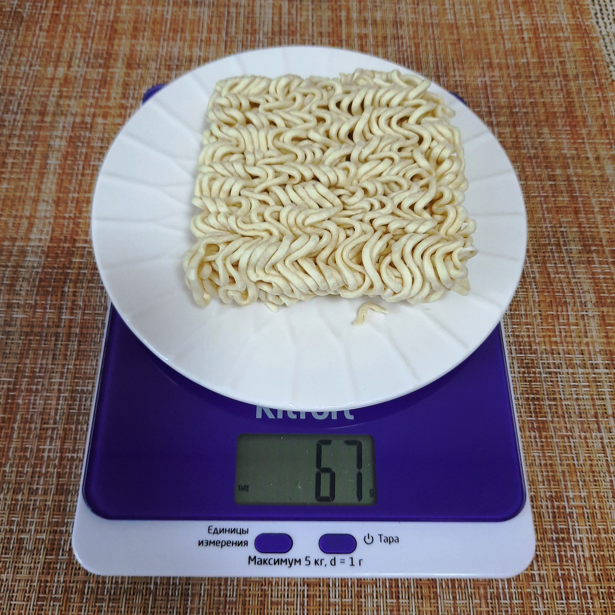 Как видим, лапша толстая, волнистая, белого цвета. Масса брикета чуть более 65 граммов.