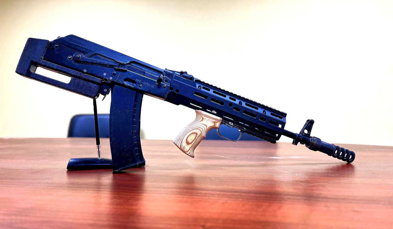 На фото ММГ АК 74 с деревянной рукояткой и прикладом. Приклад не устанавливал на данный ММГ так как он рассчитан под стационарный а заказ был на откидную версию приклада, крепления у них разные, но это не помешает нам увидеть всю разницу компоновки булл-пап по отношению к стоку.